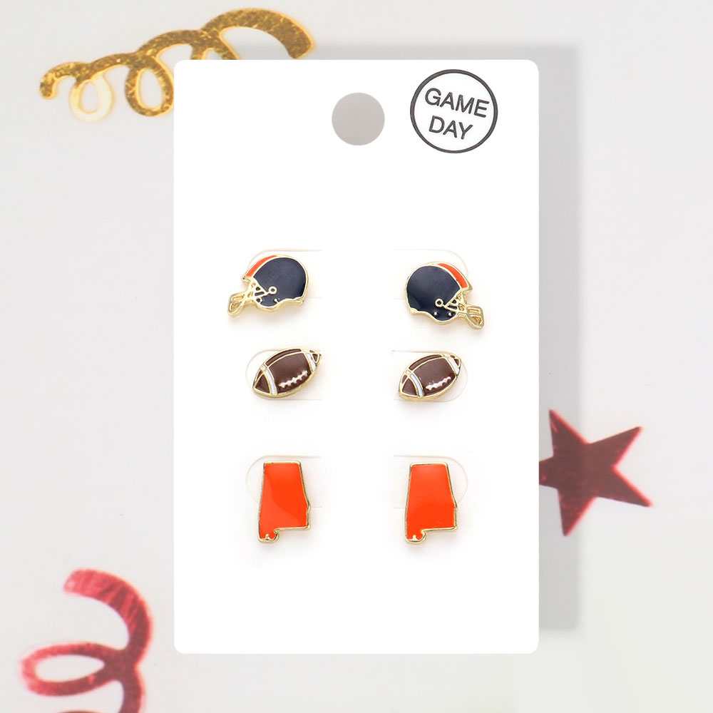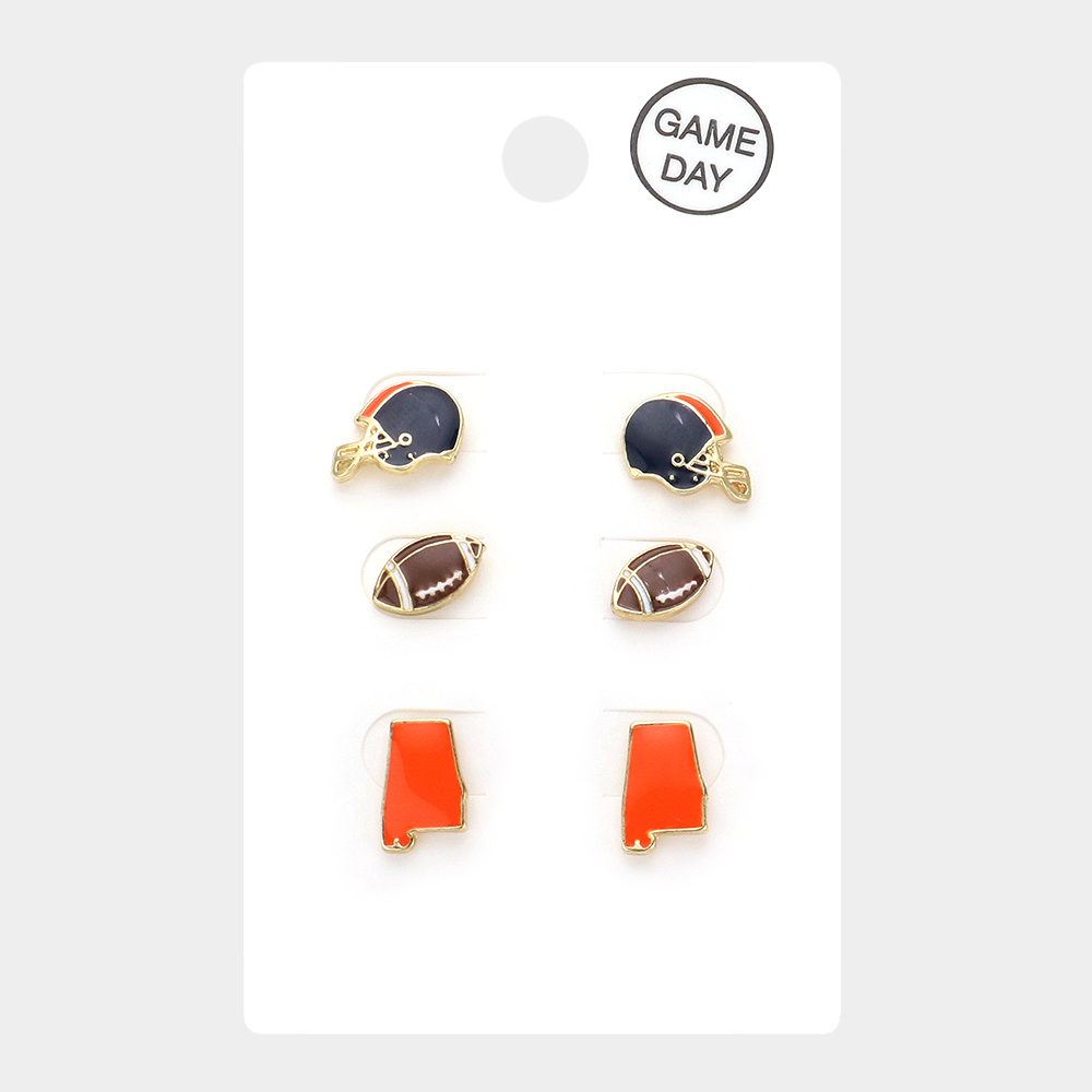 3Pairs - Game Day Auburn University Helmet Football State Map Stud Earrings