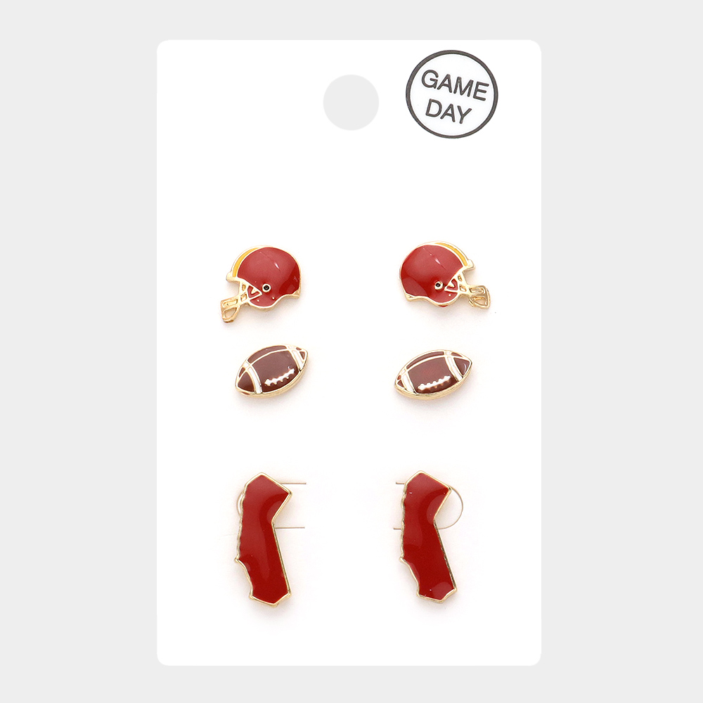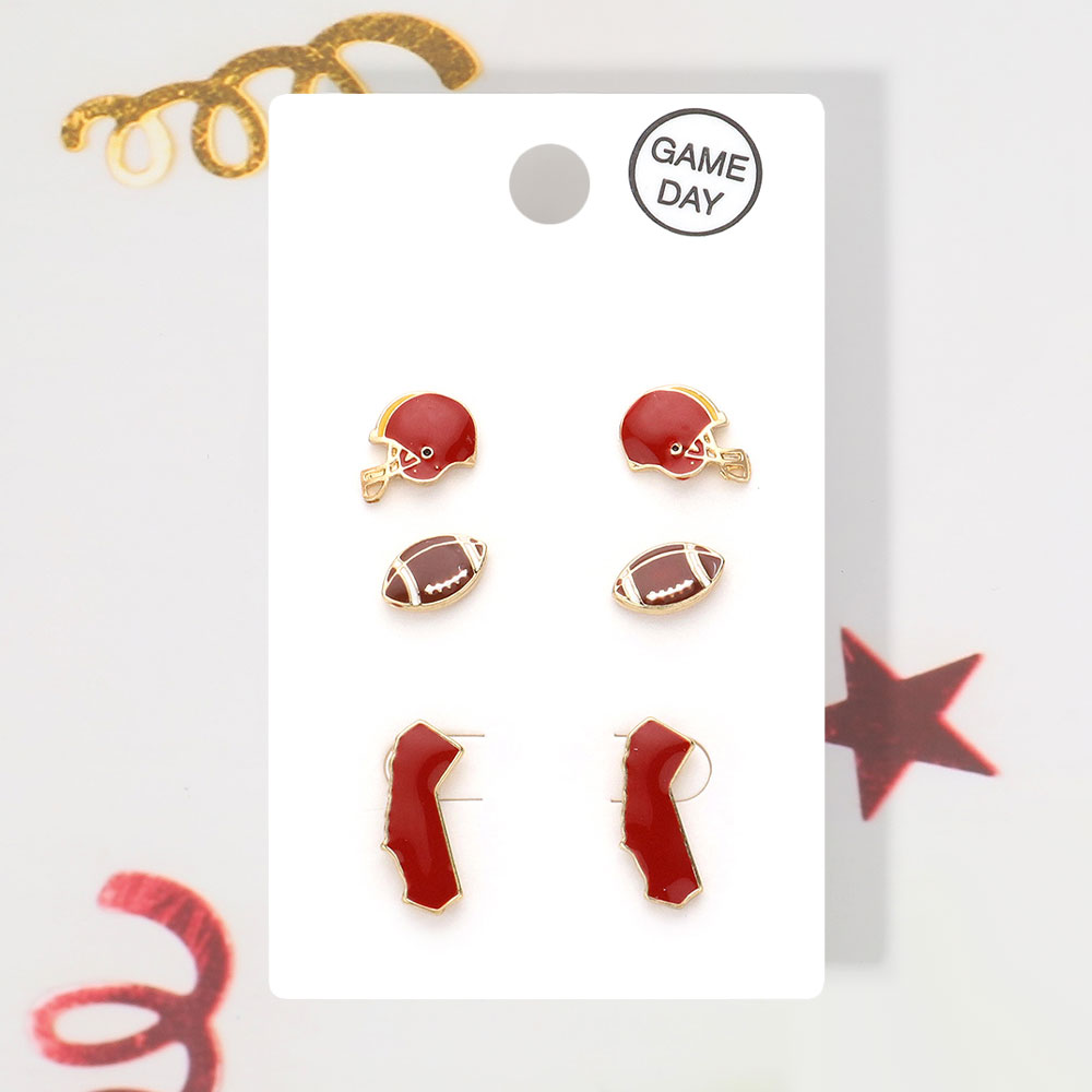 • Celebrate your team spirit with this Game Day stud earring set featuring three playful pairs inspired by sporty designs. Perfect for fans and casual wearers alike, these lightweight earrings add a fun and energetic flair to any outfit while showcasing your love for the game.