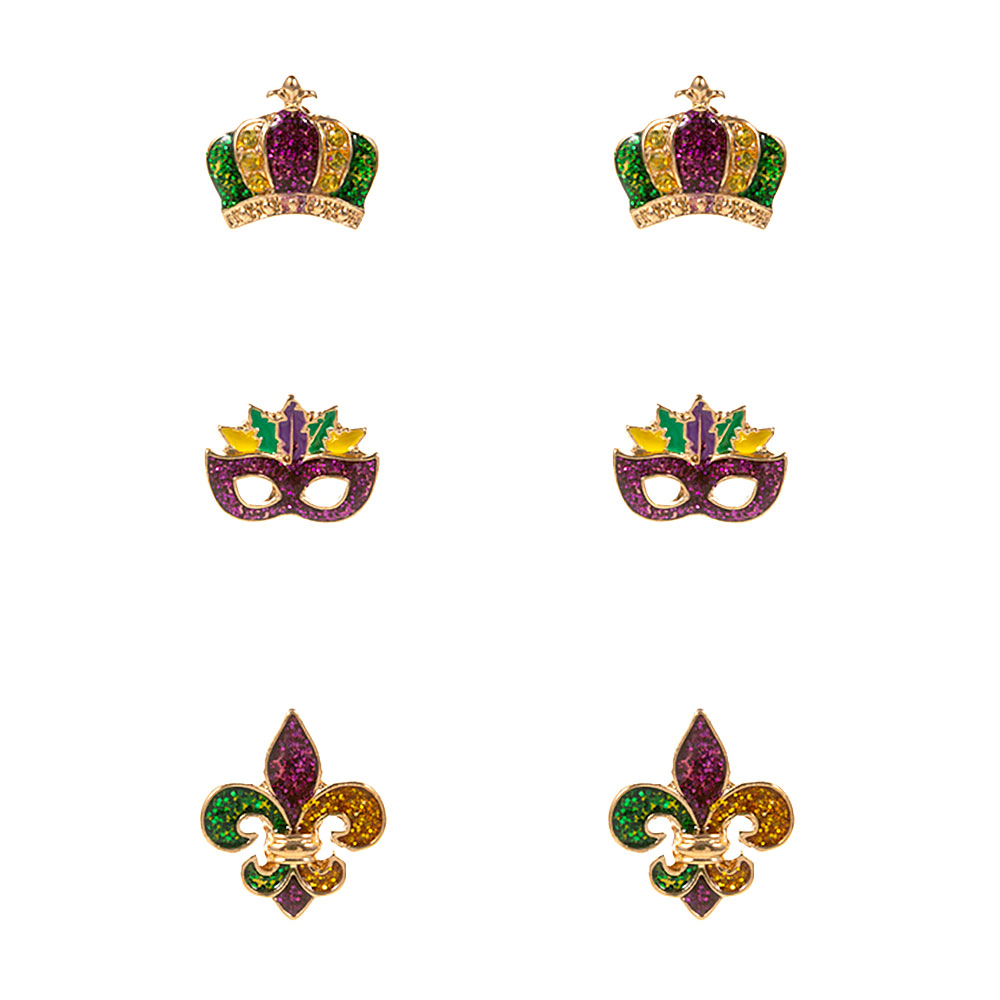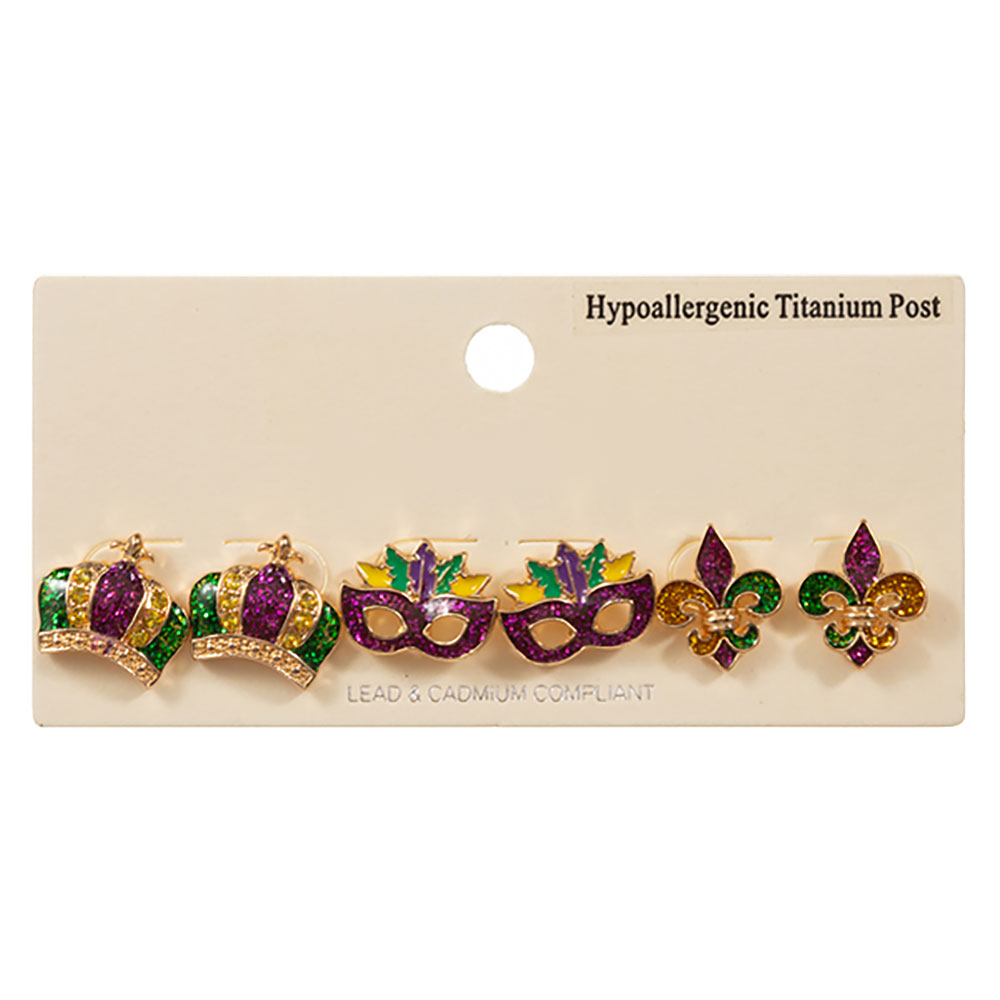 Details • Size : 0.4" L - 0.5" L • Titanium Post Back • Celebrate in style with this Mardi Gras Stud Earring Set featuring crown, mask, and fleur-de-lis designs. Crafted with sparkling festive details and hypoallergenic posts, this trio brings a joyful carnival flair to any outfit for parties, parades, or events. • Hypoallergenic • Lead and Nickel Compliant