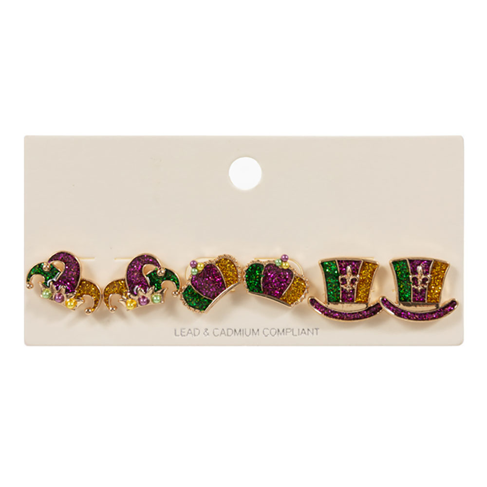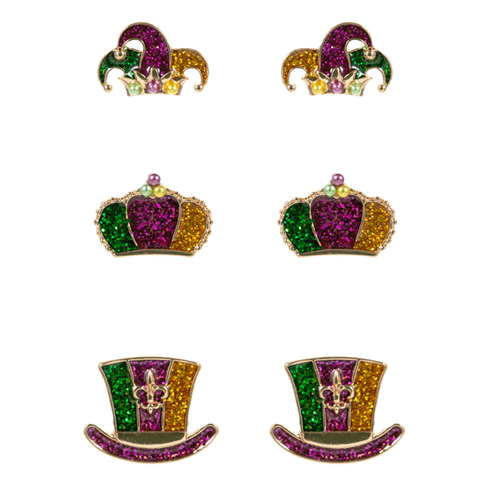 Details • Size : 0.4" L - 0.5" L • Titanium Post Back • Celebrate in style with this Mardi Gras Mini Earring Set featuring playful jester, crown, and hat studs. Designed with sparkling festive details, this set adds a joyful touch to any parade or party outfit, perfect for embracing the carnival spirit. • Hypoallergenic • Lead and Nickel Compliant