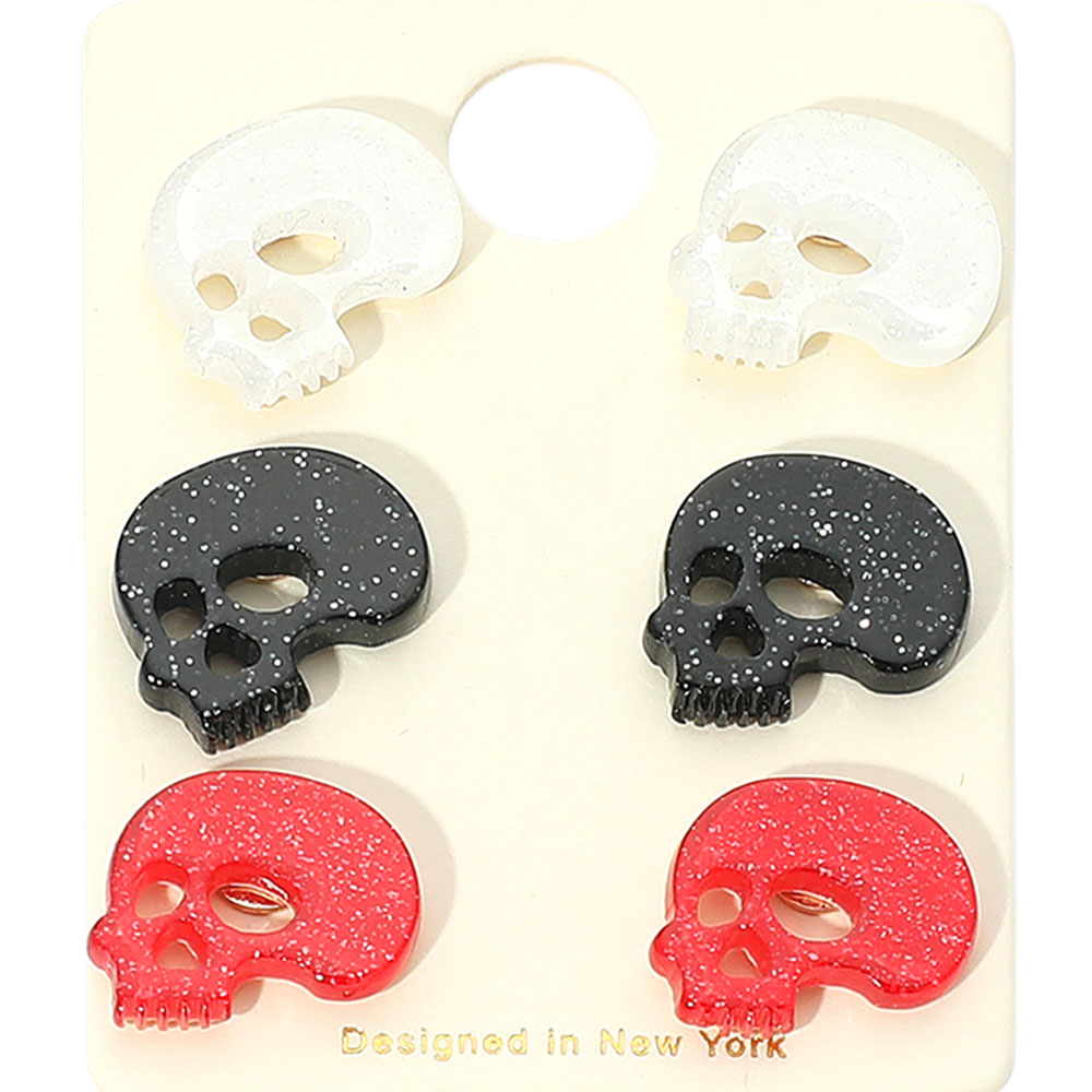 Details • Size : 0.5" L • Post Back • Set of three skull stud earring pairs featuring glitter and matte finishes. A bold and playful accessory for edgy everyday looks, Halloween outfits, or statement styling. Lightweight and fun to wear. • Lead and Nickel Compliant