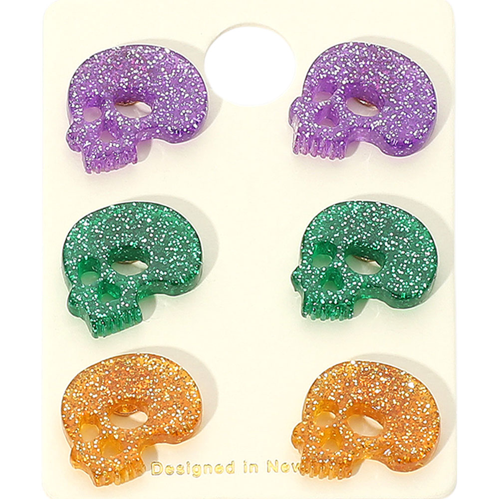 Details • Size : 0.5" L • Post Back • Set of three skull stud earring pairs featuring glitter and matte finishes. A bold and playful accessory for edgy everyday looks, Halloween outfits, or statement styling. Lightweight and fun to wear. • Lead and Nickel Compliant