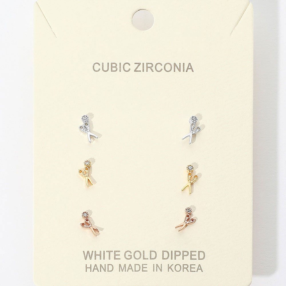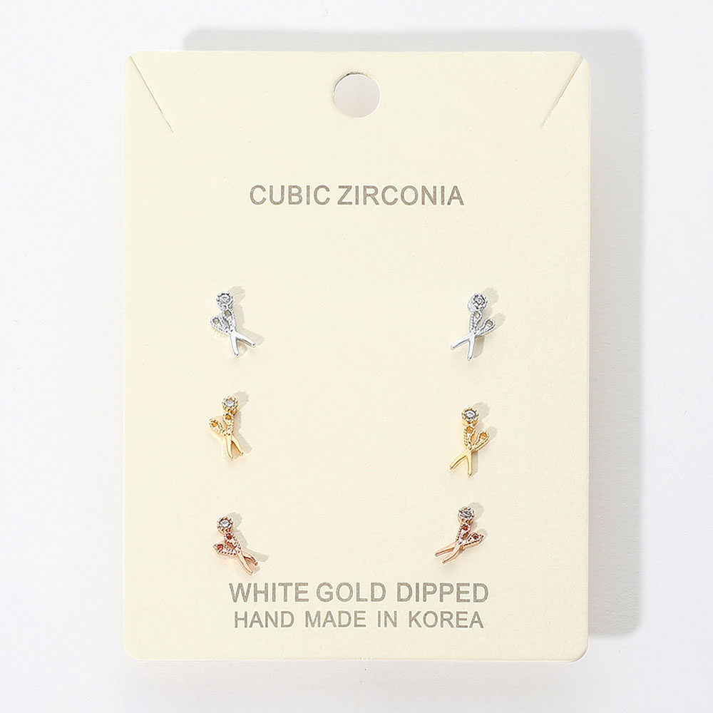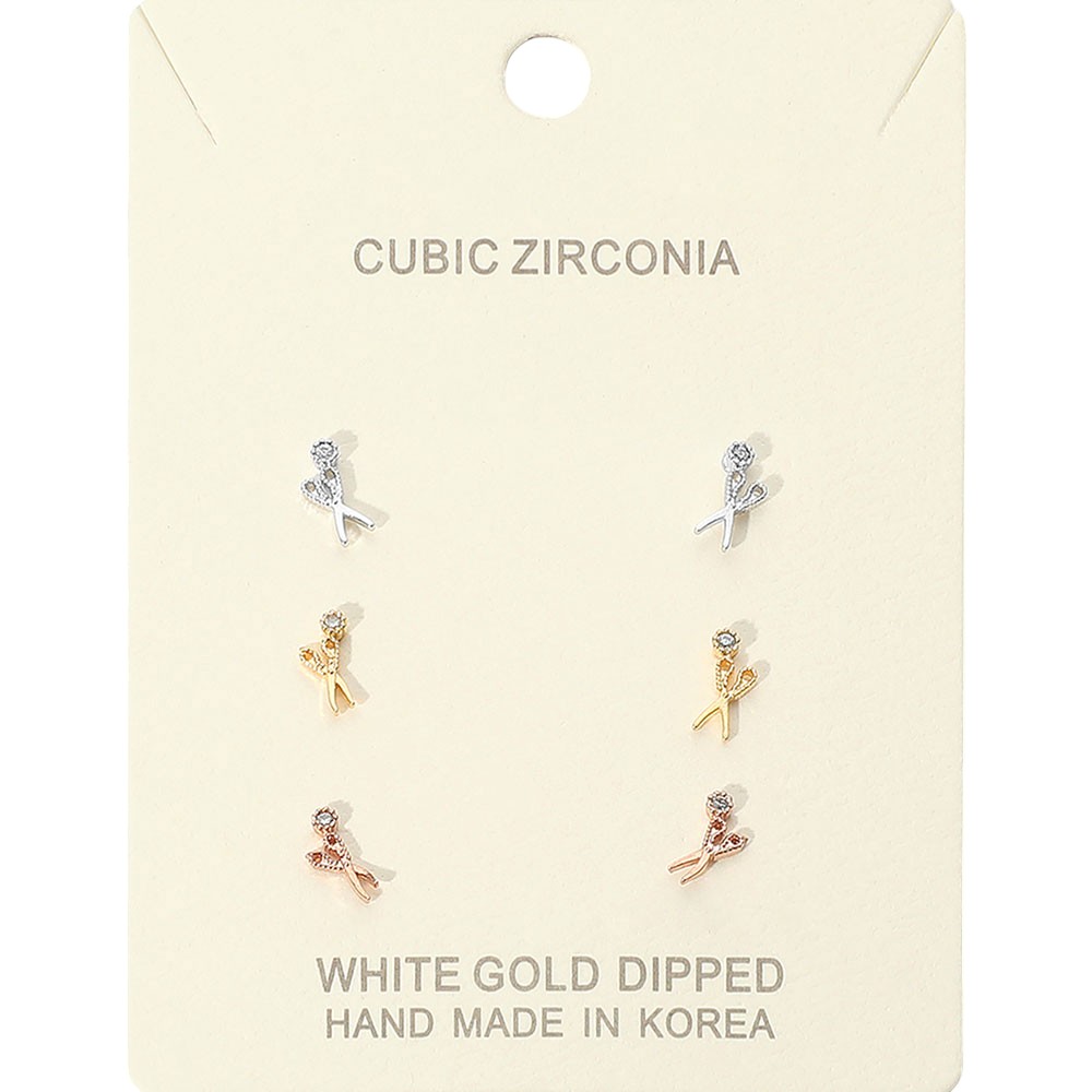 Details • Size : 0.25" L • Post Back • Delicate Scissor-shaped stud earrings featuring sparkling cubic zirconia accents. This elegant three-pair set offers a romantic touch, perfect for everyday elegance or thoughtful gifting. • Lead and Nickel Compliant • Made In Korea • Gold Dipped • CZ Cubic Zirconia