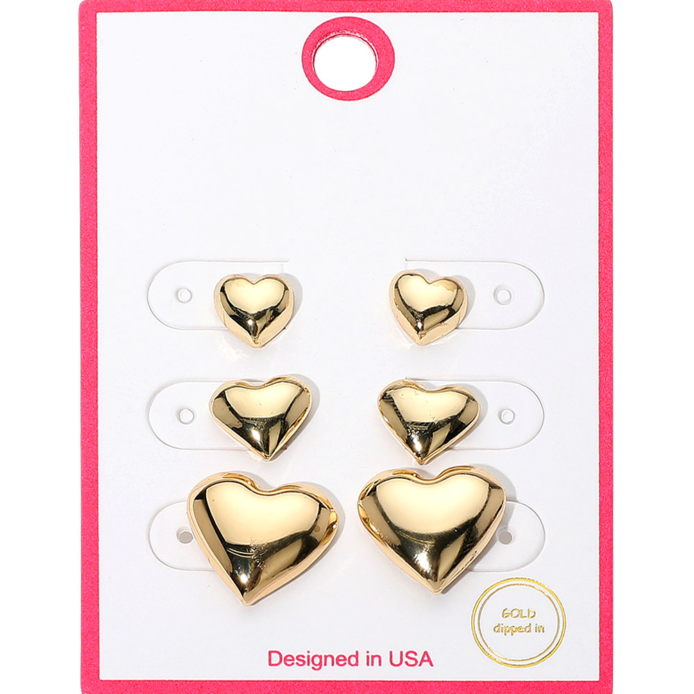 Details • Size : 0.3" - 0.6" L • Post Back • Charming set of puffy heart stud earrings in three sizes. These glossy heart studs offer a sweet, timeless accent for any outfit, perfect for gifting or mixing and matching across looks. • Lead and Nickel Compliant • Gold Dipped