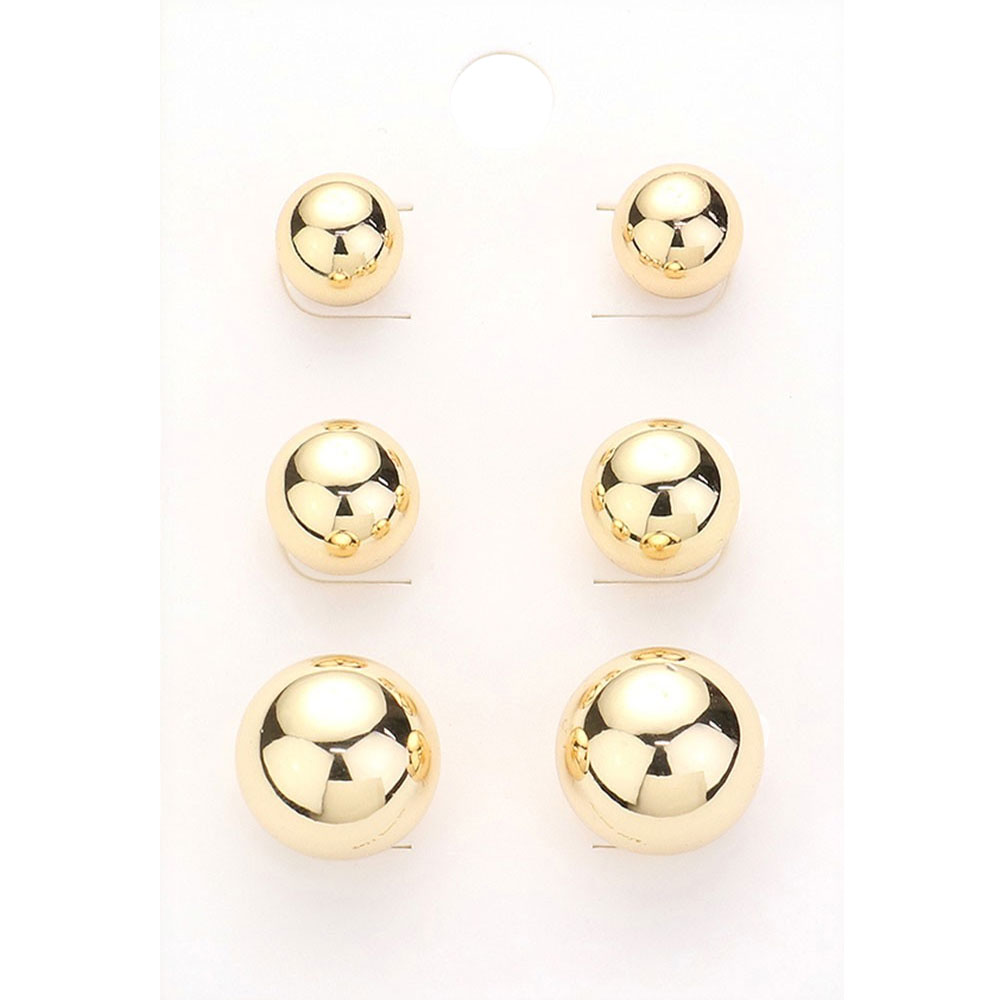 Details • Size : 0.3" L - 0.6" L • Post Back • Versatile earring set featuring three pairs of polished round ball studs in varying sizes. Perfect for mixing and matching, these minimalist earrings add a timeless and refined touch to any jewelry collection. Ideal for everyday or layered looks. • Lead and Nickel Compliant • Gold Dipped