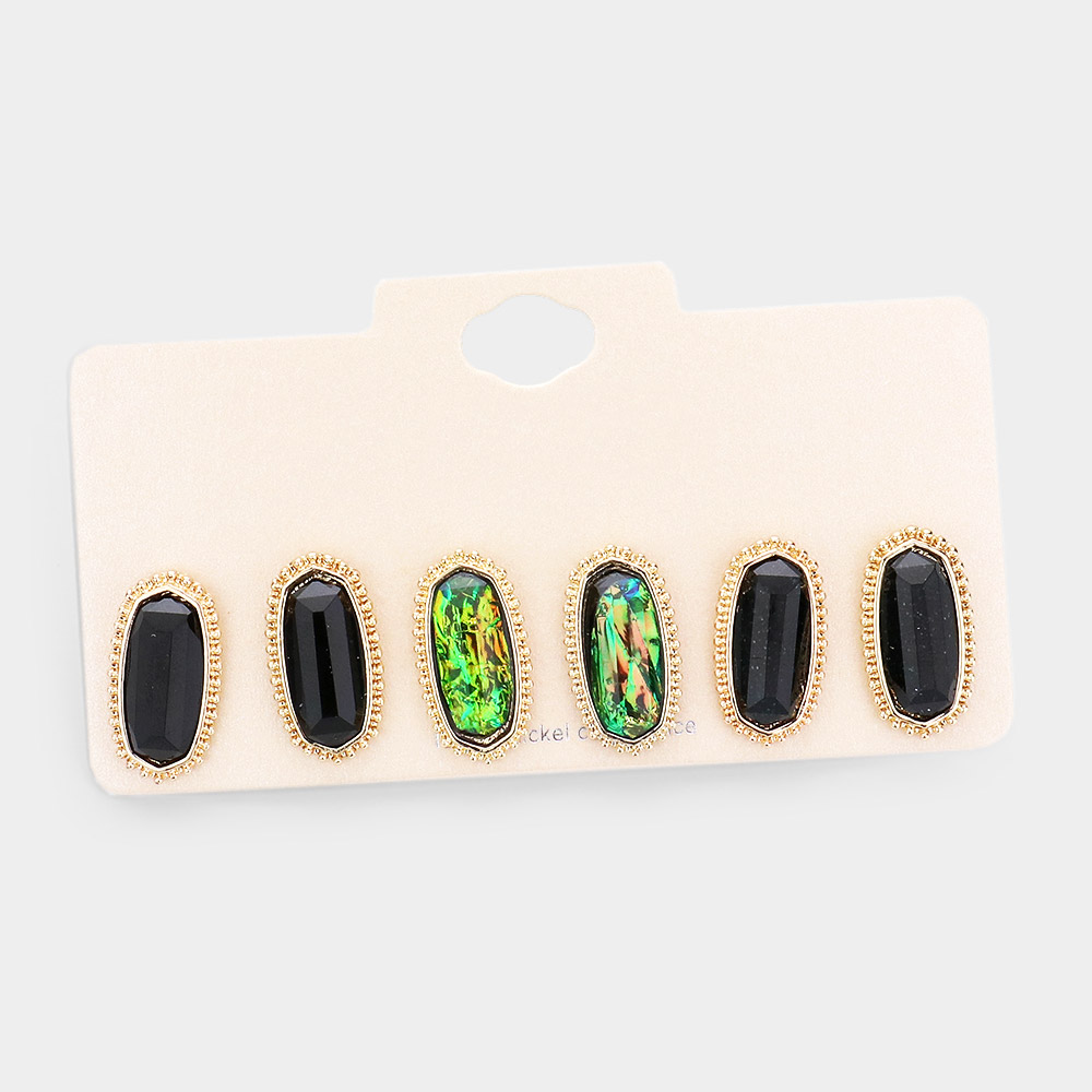 3Pairs - Gold Trim Hexagon Bead Stud Earrings