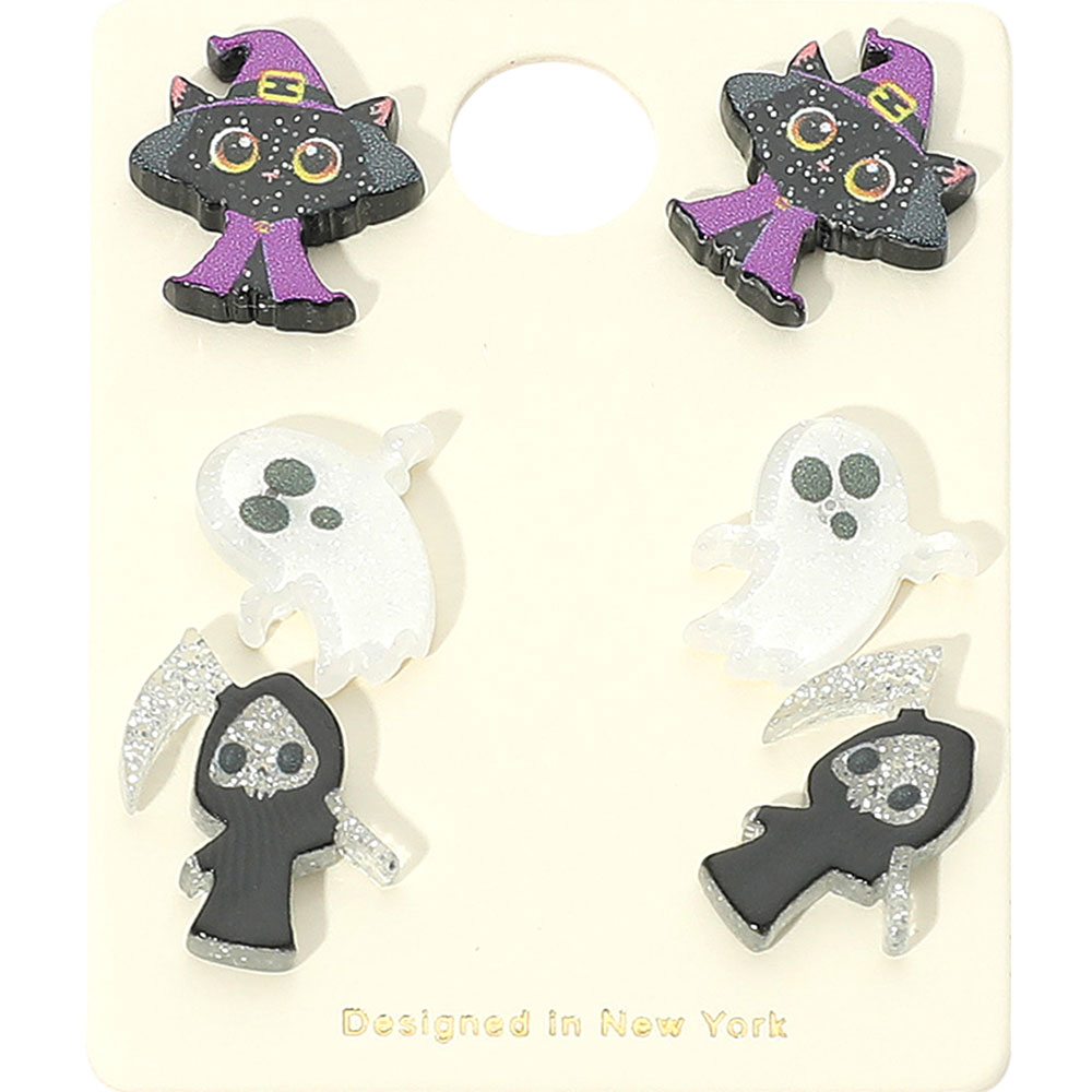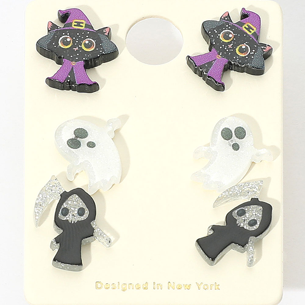 Details • Size : 0.5" - 0.6" L • Post Back • Whimsical Halloween stud earrings set featuring a witch cat, sparkling ghosts, and a glittery grim reaper. Perfect for adding spooky charm to your seasonal outfits. Lightweight and festive accessory. • Lead and Nickel Compliant
