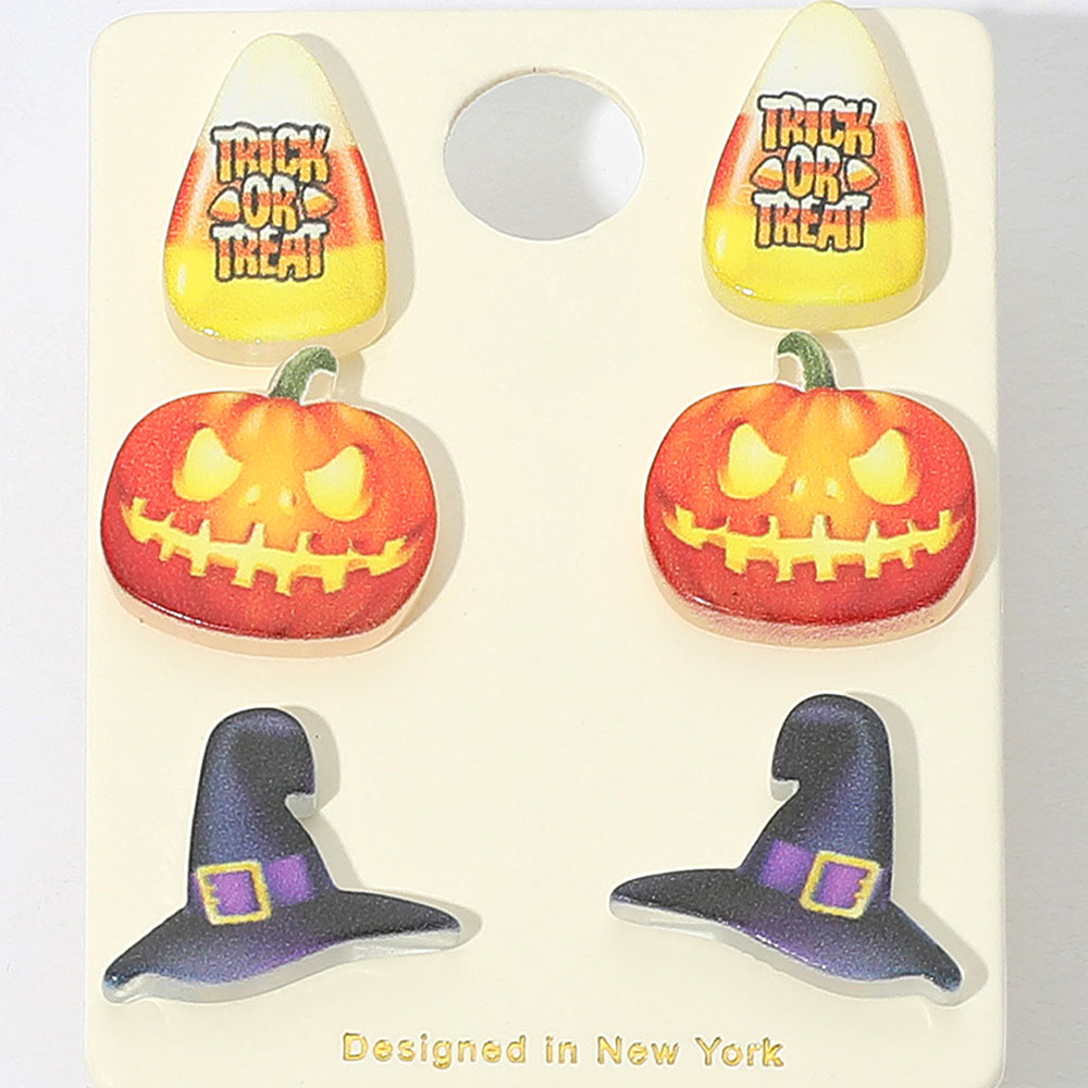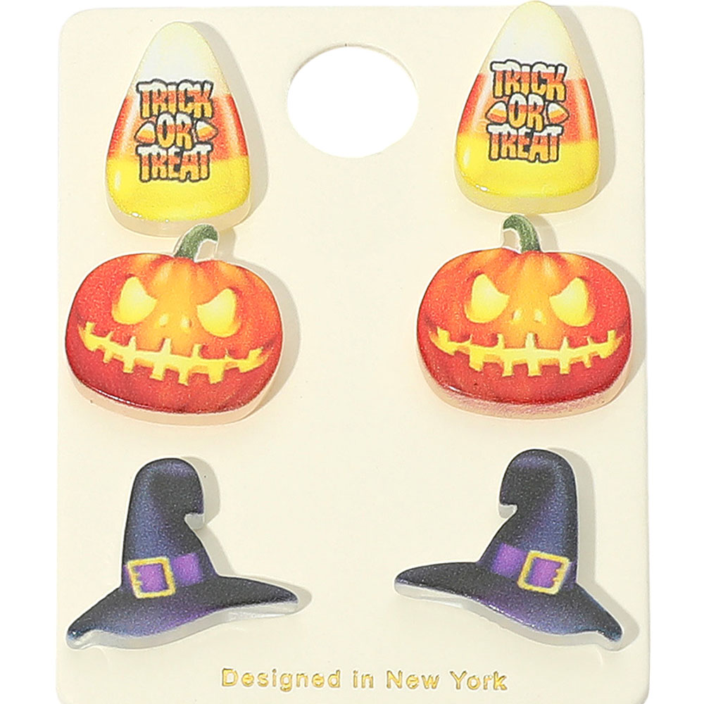 Details • Size : 0.5" - 0.7" L • Post Back • Add festive flair with this 3-pair Halloween stud earring set featuring "Trick or Treat" candy corn, glowing jack-o’-lanterns, and classic witch hats. Perfect for mixing, matching, or gifting, these playful earrings are great for costumes, parties, or seasonal style. • Lead and Nickel Compliant