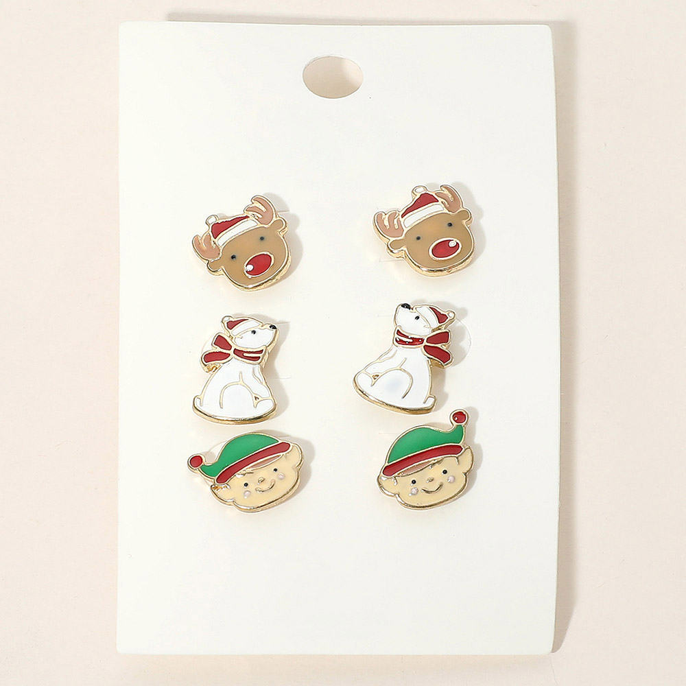 Details • Size : 0.4" - 0.5" L • Post Back • Bring festive charm to your accessories with this holiday stud earring set featuring a playful trio of reindeer, polar bear, and elf designs. Perfect for seasonal outfits, parties, or gifting, these cheerful earrings add a fun and whimsical touch to any winter look. • Lead and Nickel Compliant