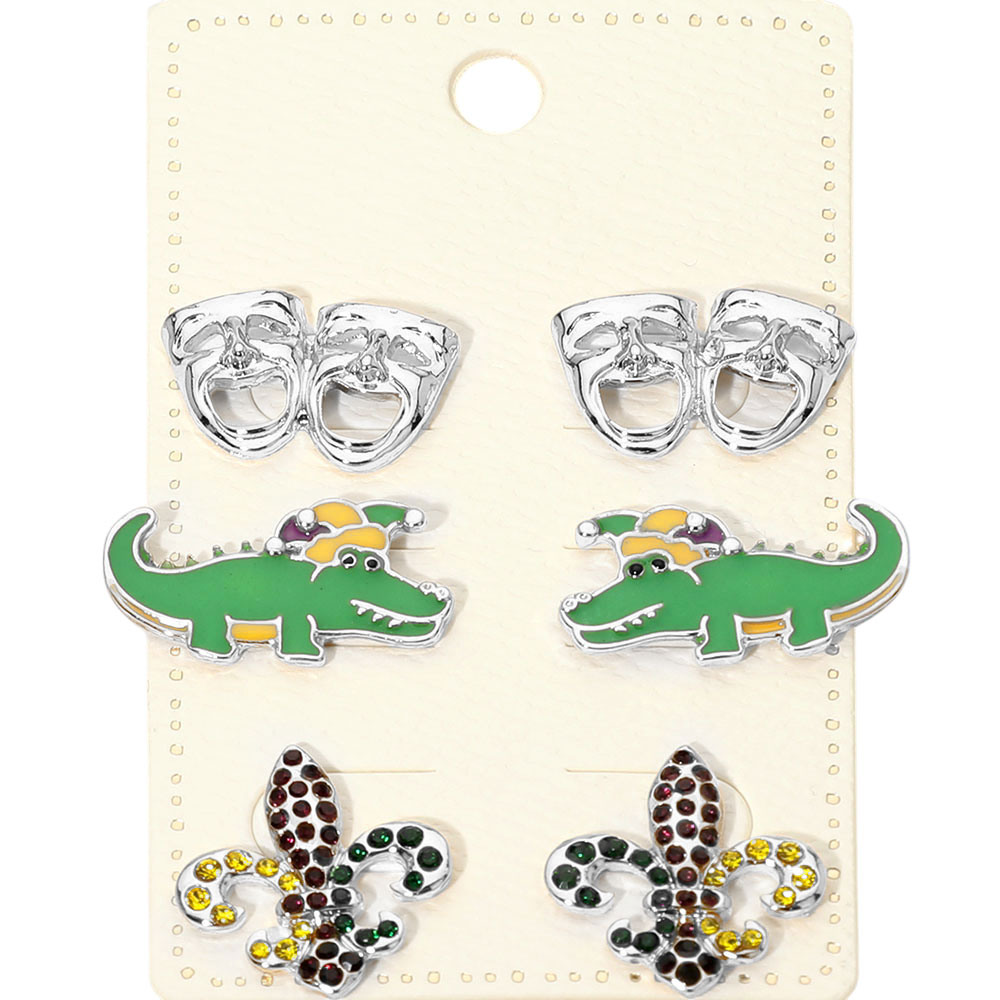 3Pairs - Mardi Gras Mask Crocodile Fleur de Lis Stud Earring Set