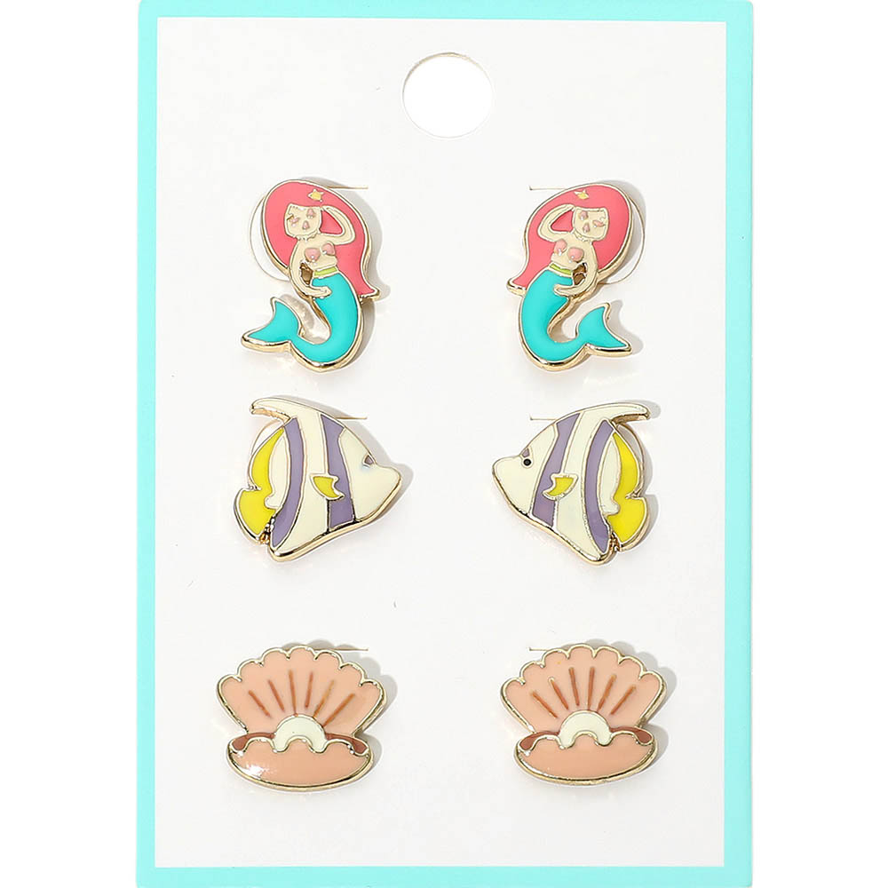 Details • Size : 0.5" - 0.75" L • Post Back • Adorable earring set featuring mermaids, tropical fish, and seashell studs. This 3-pack brings ocean fun to everyday looks and makes a charming gift for young girls who love underwater adventures. • Lead and Nickel Compliant