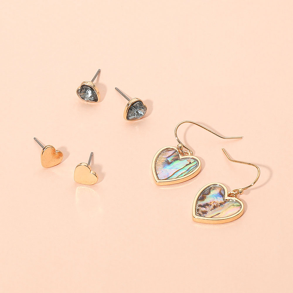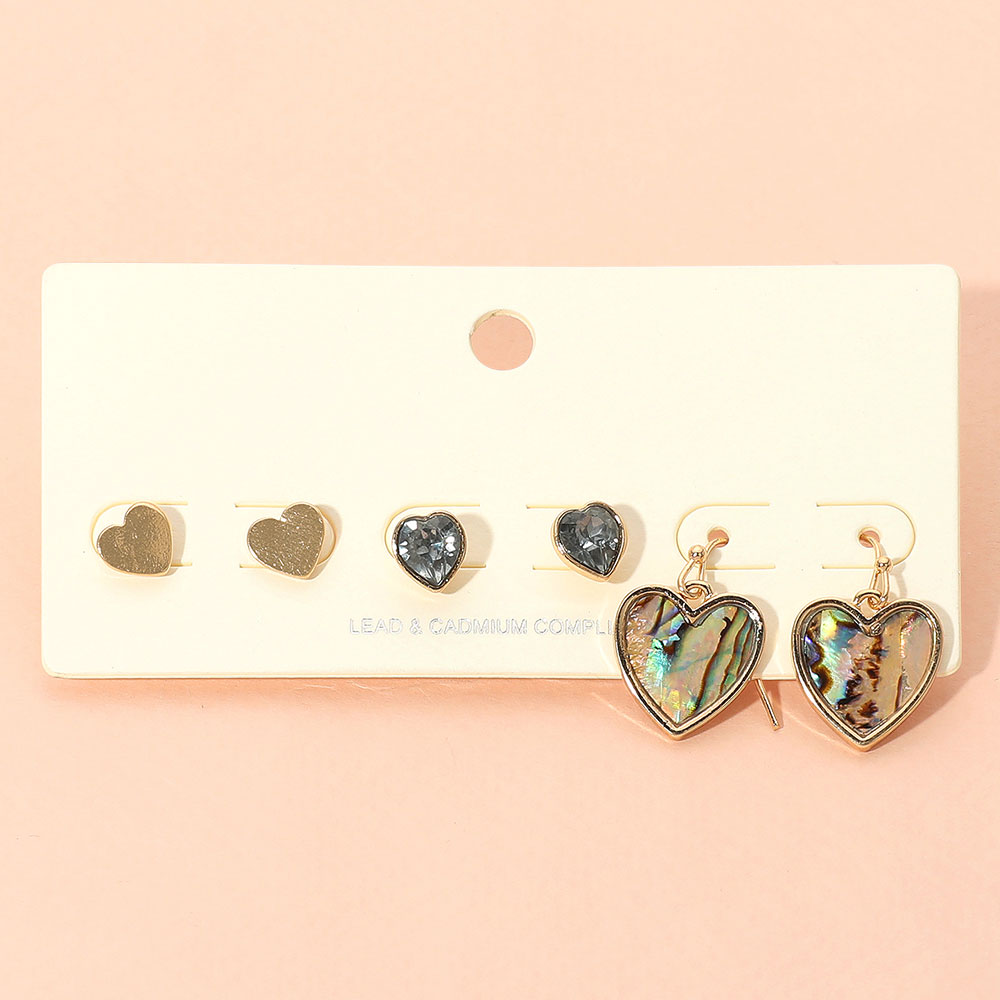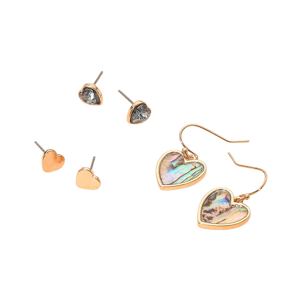 Details • Size : 0.25" L, 1.2" L • Post Back / Fish Hook Back • Add charm to your look with this 3-pair heart earring set featuring matte, faceted, and glossy finishes. A versatile accessory for casual and dressy outfits, offering unique style and personality. • Lead and Nickel Compliant