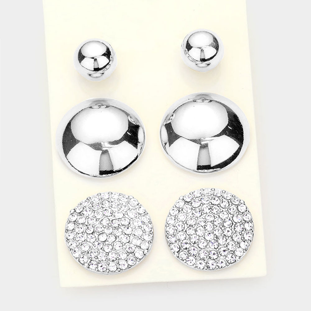 3Pairs - Metal Ball Rhinestone Embellished Round Stud Earrings
