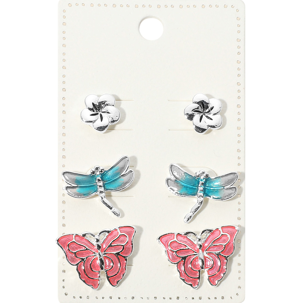 3Pairs - Metal Flower Enamel Dragonfly Butterfly Stud Earring Set