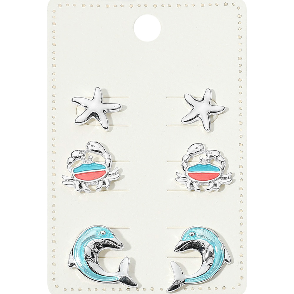 3Pairs - Metal Starfish Enamel Crab Dolphin Stud Earrings Set