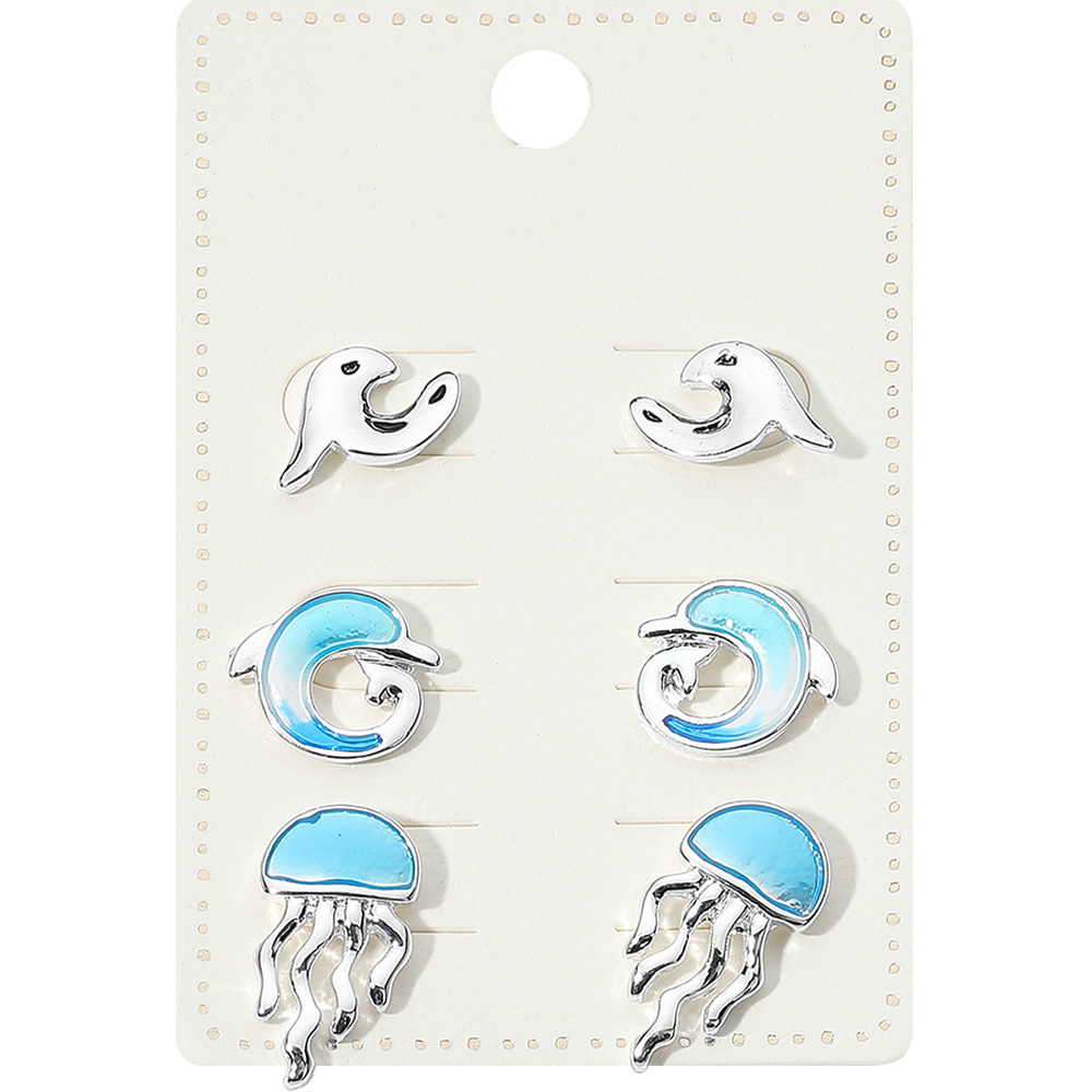 3Pairs - Metal Wave Enamel Dolphin Jellyfish Stud Earring Set
