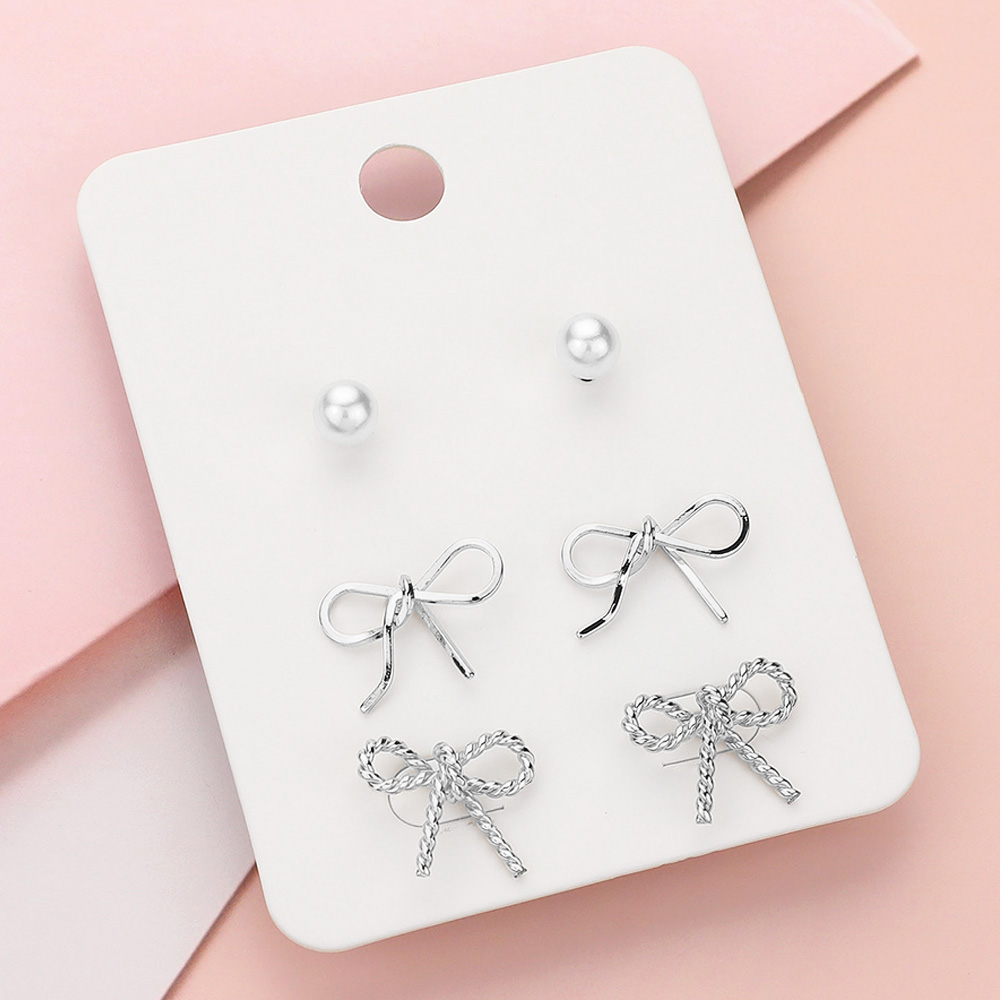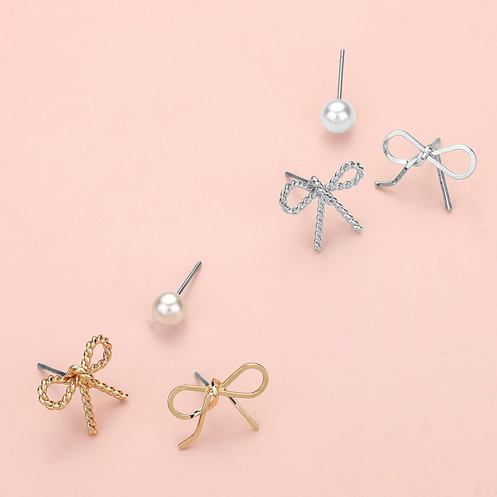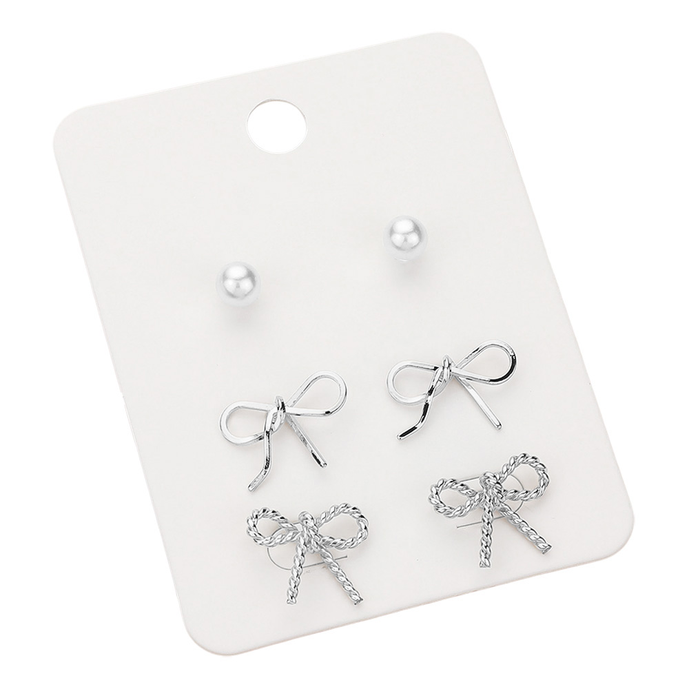 3Pairs - Pearl Metal Bow Stud Earrings Set