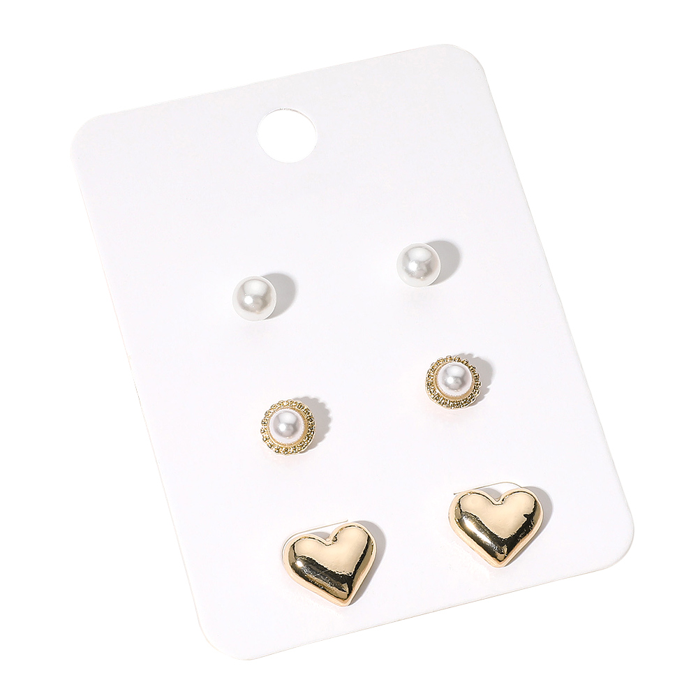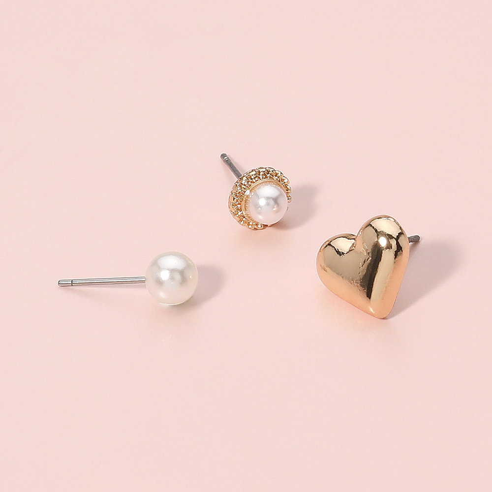 3Pairs - Pearl Metal Heart Stud Earring Set