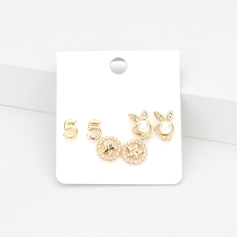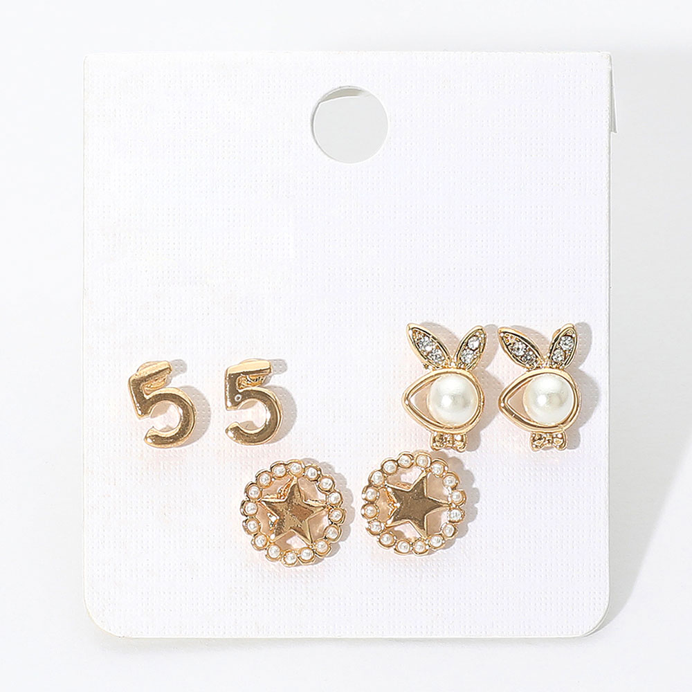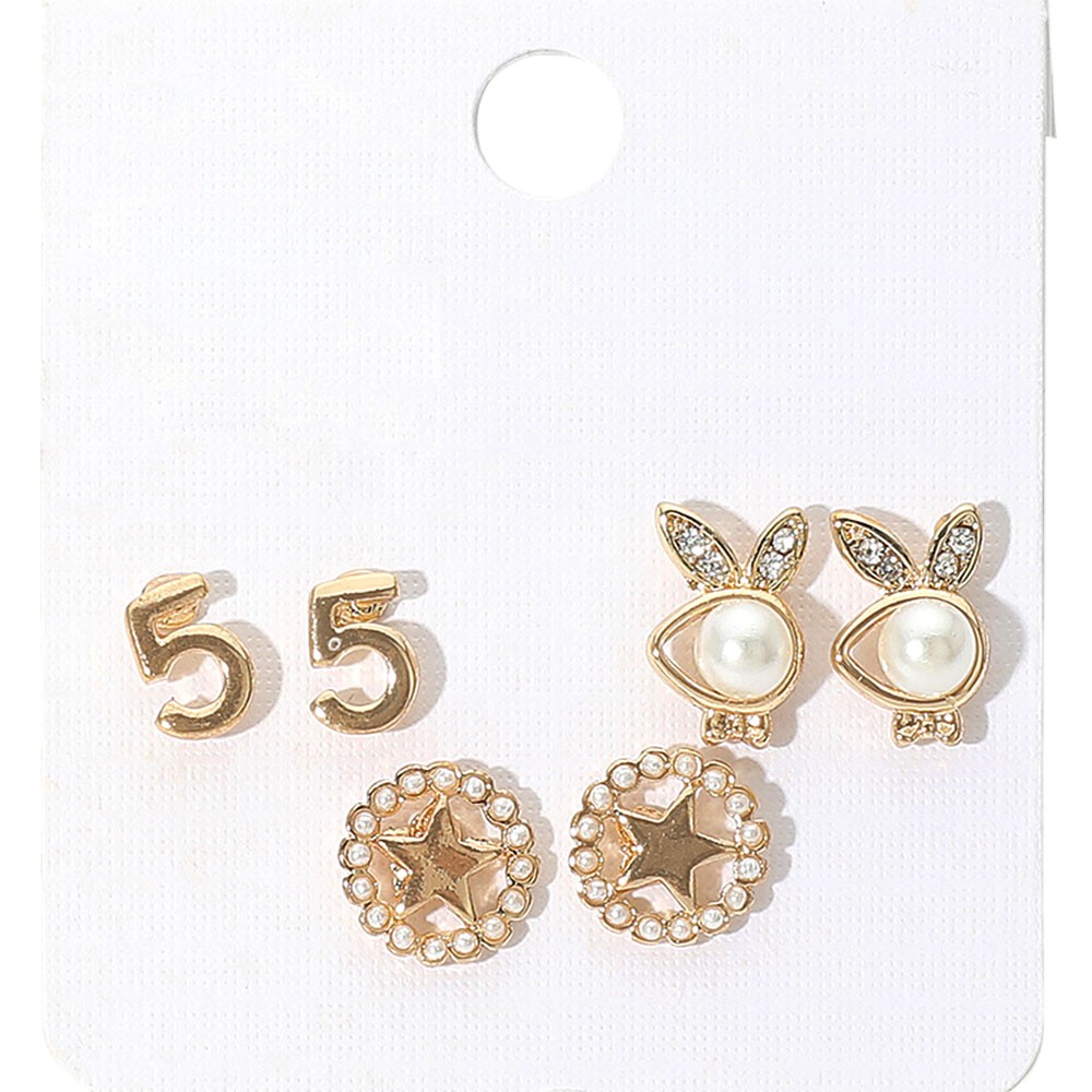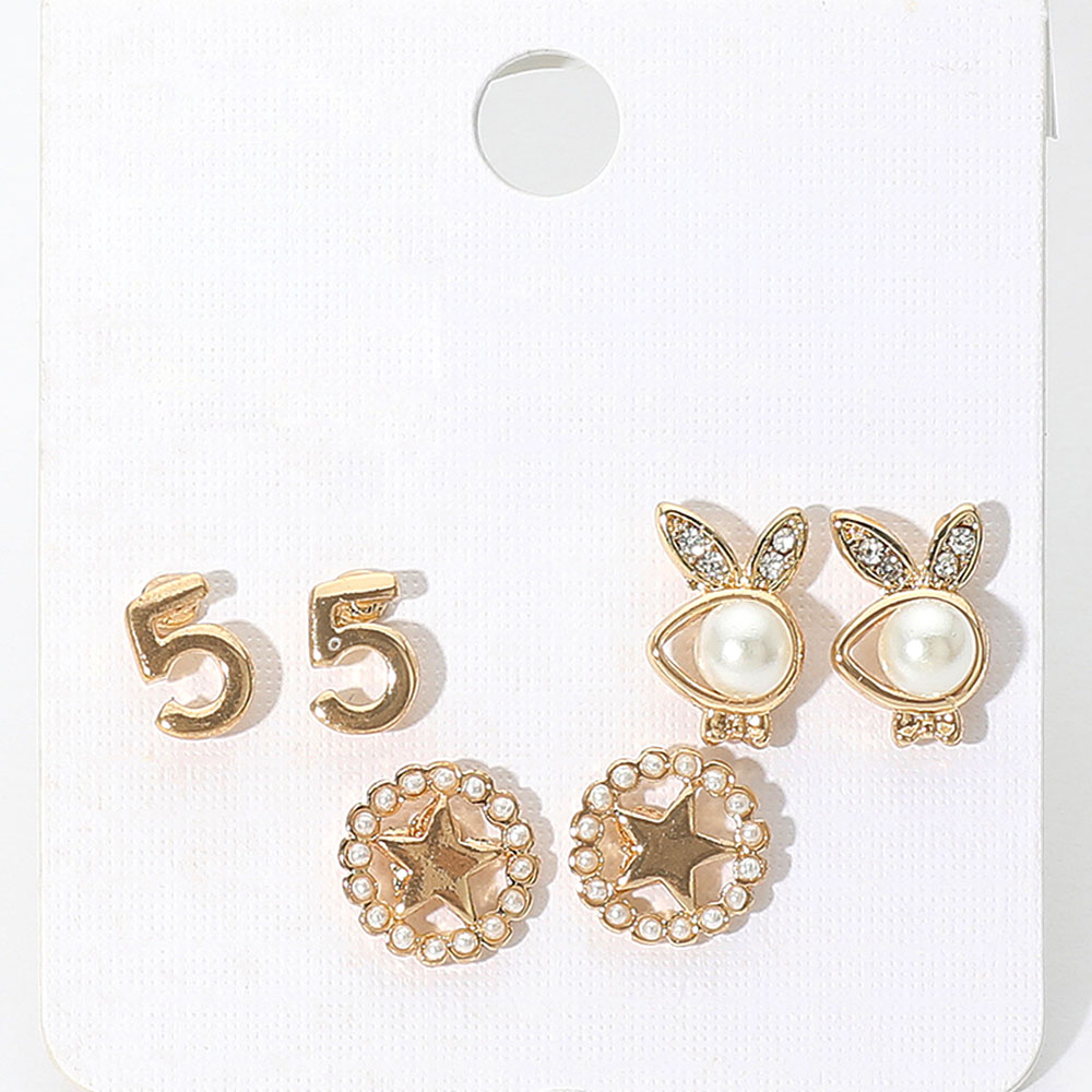 Details • Size : 0.3" L, 0.5" L, 0.4" L • Post Back • Fun and stylish earring set featuring bunny designs with pearl centers, star patterns, and bold number studs. A unique mix of playful and chic elements perfect for everyday wear or gifting. • Lead and Nickel Compliant