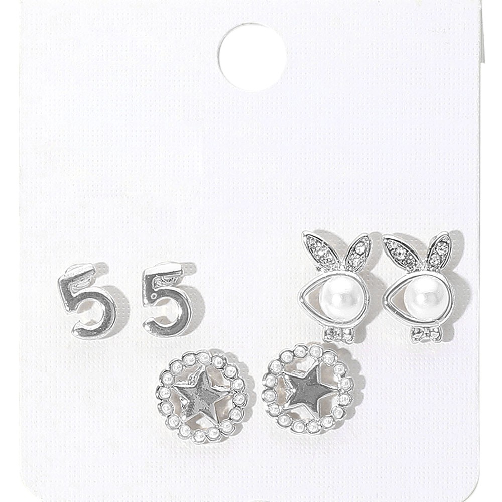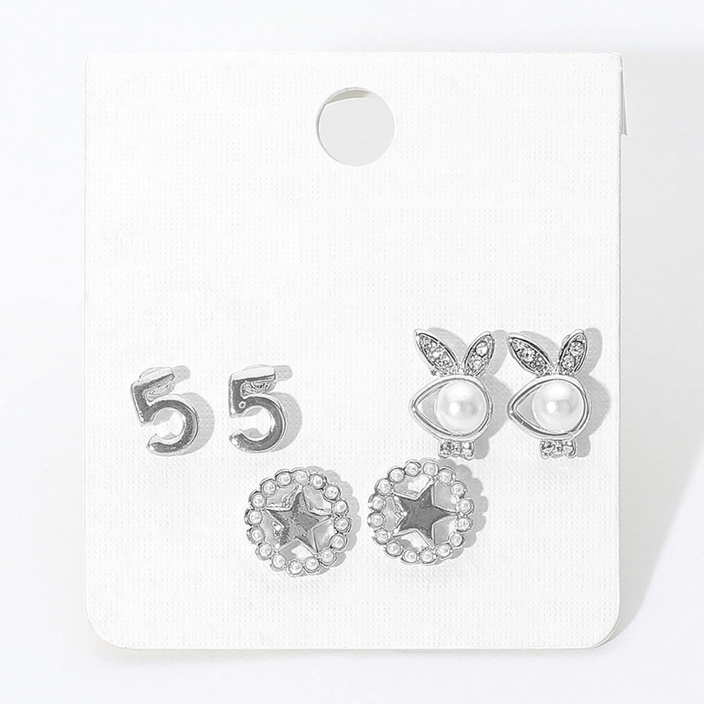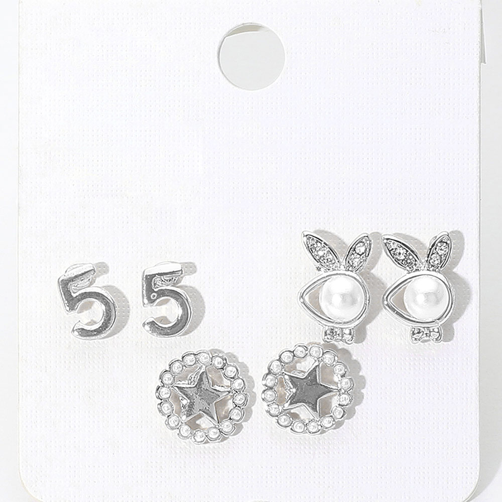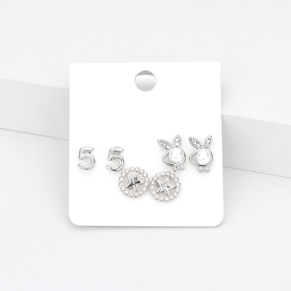 Details • Size : 0.3" L, 0.5" L, 0.4" L • Post Back • Fun and stylish earring set featuring bunny designs with pearl centers, star patterns, and bold number studs. A unique mix of playful and chic elements perfect for everyday wear or gifting. • Lead and Nickel Compliant