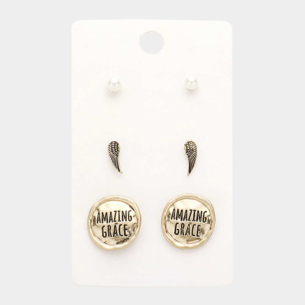 3Pairs - Pearl Wing AMAZING GRACE Message Stud Earrings