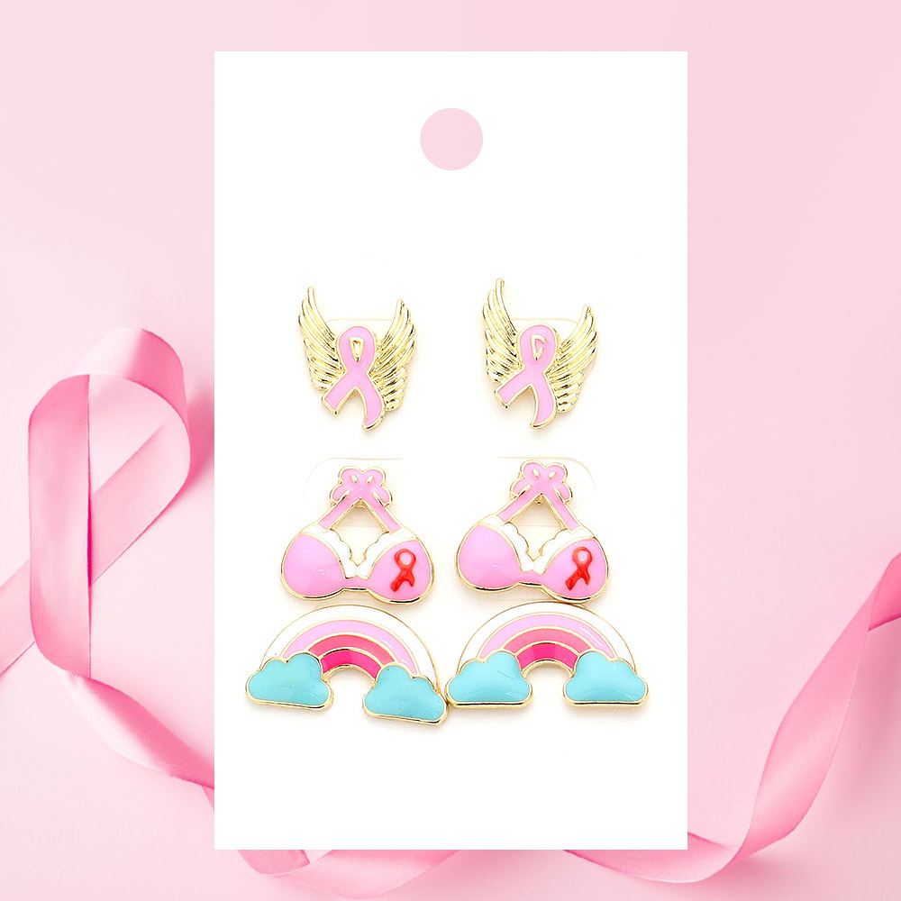 Details • Size : 0.5" L - 0.75" L • Post Back • Express support and positivity with this awareness stud earring set featuring ribbon, bra, and rainbow motifs. A meaningful accessory pack that promotes strength, hope, and inspiration for every occasion. • Lead and Nickel Compliant