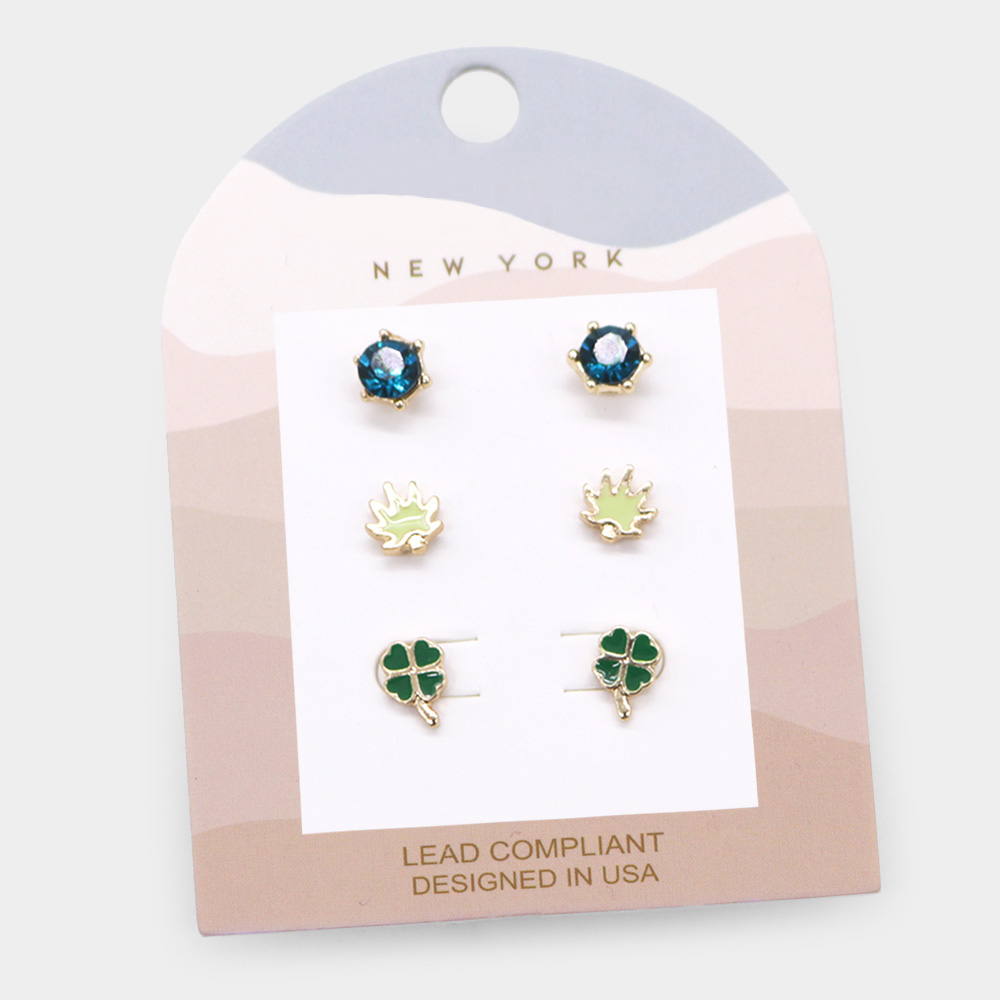 3Pairs - Round Stone Enamel Leaf Clover Stud Earrings