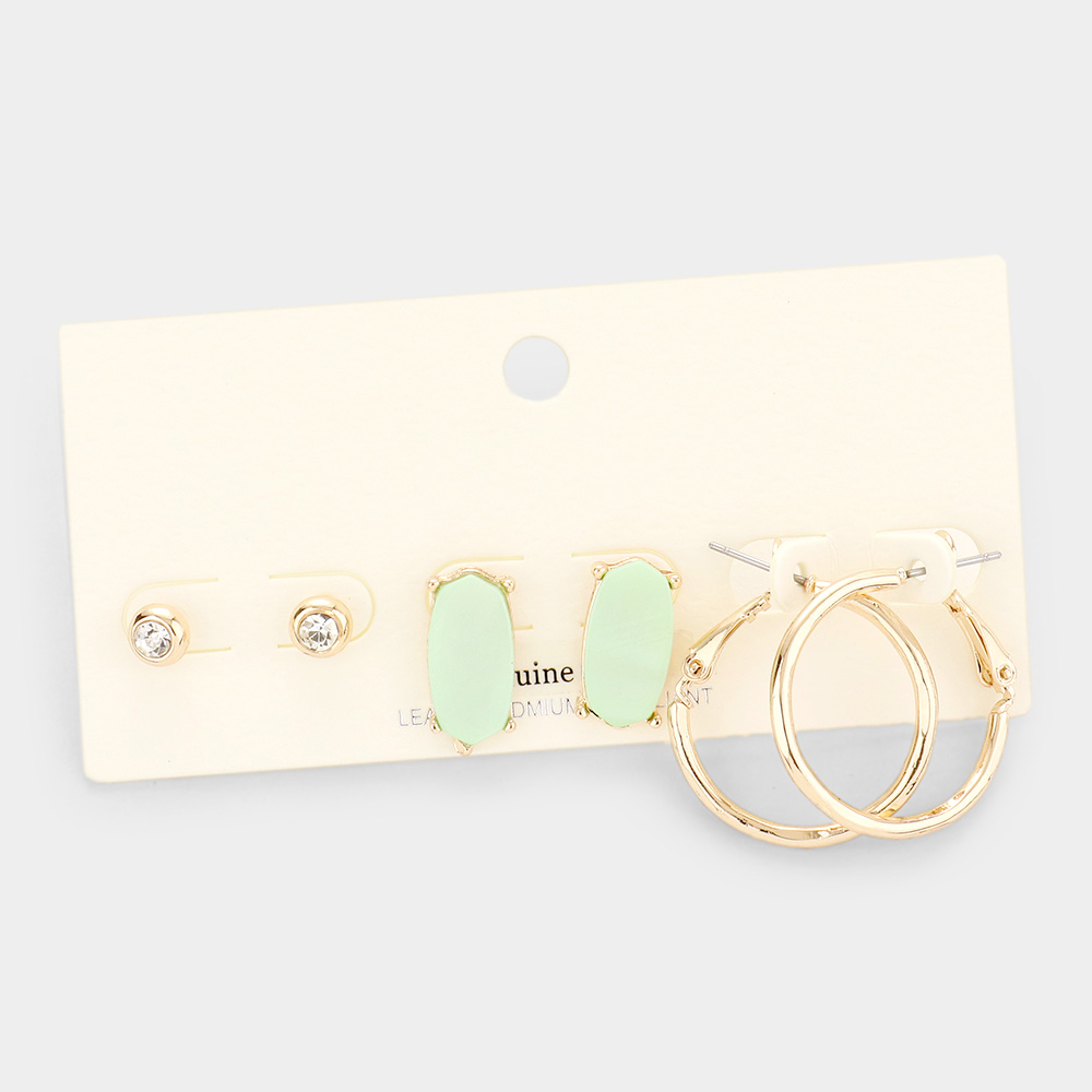 3Pairs - Round Stone Hexagon Bead Metal Hoop Earrings