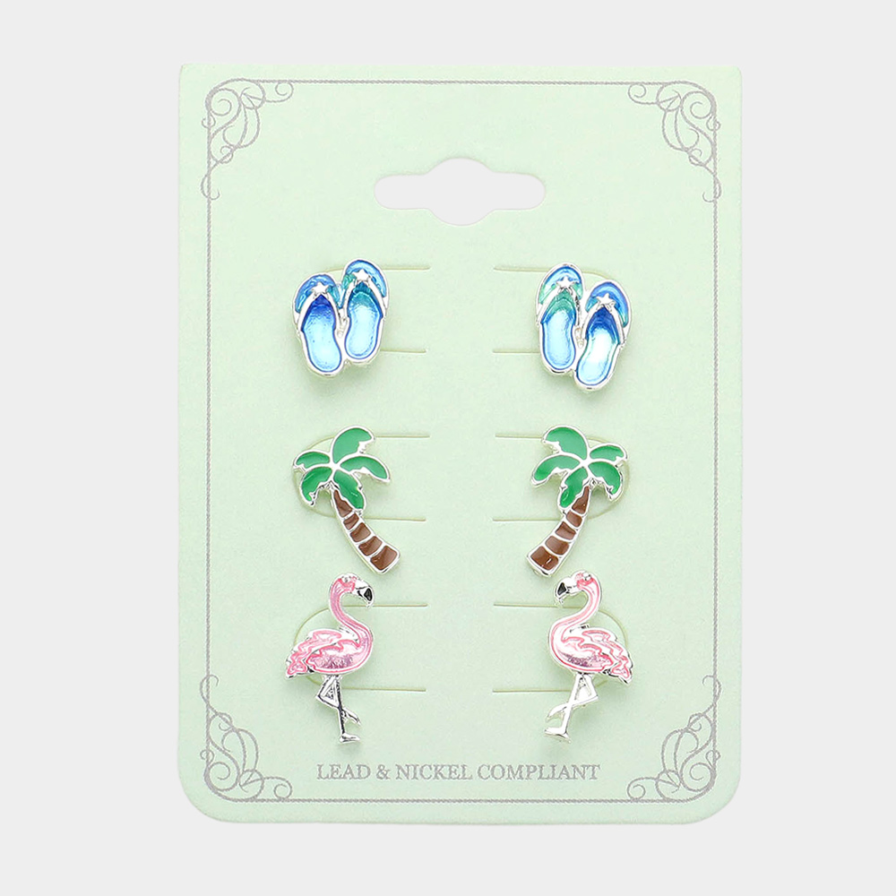 3PAIRS - Shoes Palm Tree Flamingo Stud Earrings Set