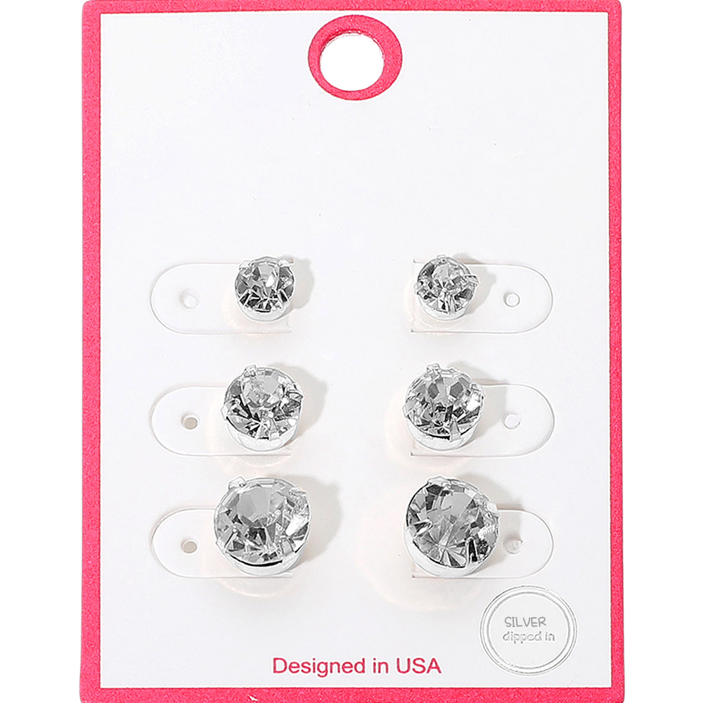 Details • Size : 0.25" - 0.4" L • Post Back • Elegant stud earring set featuring three pairs with sparkling crystals in graduated sizes. A timeless accessory for both casual and formal looks, perfect for layering or solo wear. • Sterling Silver Dipped • Lead and Nickel Compliant