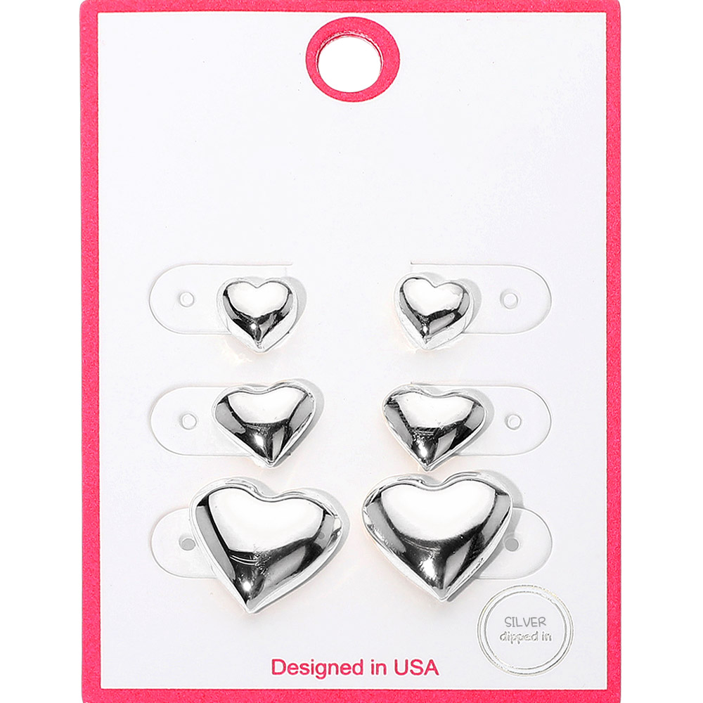 Details • Size : 0.3" - 0.6" L • Post Back • Charming set of puffy heart stud earrings in three sizes. These glossy heart studs offer a sweet, timeless accent for any outfit, perfect for gifting or mixing and matching across looks. • Sterling Silver Dipped • Lead and Nickel Compliant