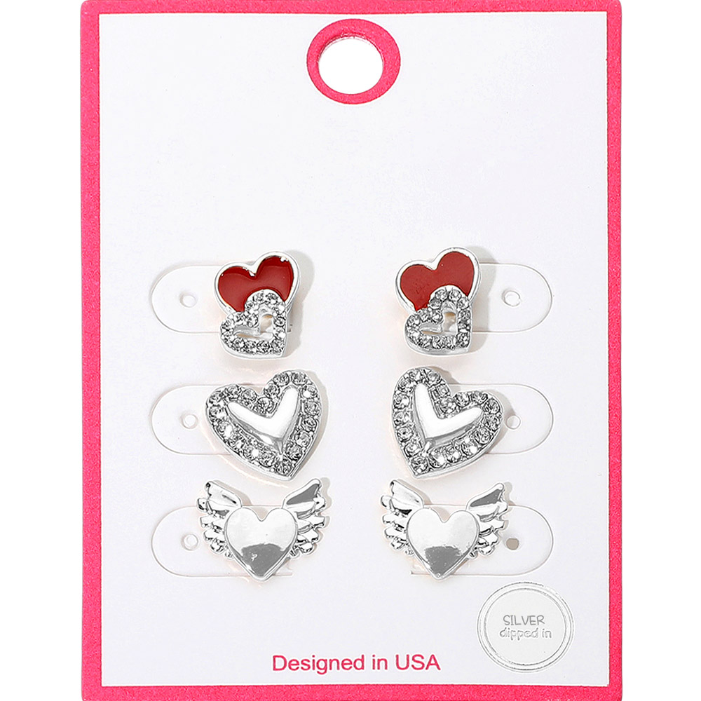 Details • Size : 0.4" - 0.5" L • Post Back • Set of three stud earrings featuring heart motifs with sparkling accents and winged designs. A playful and charming accessory trio perfect for mixing, matching, or gifting for any occasion. • Lead and Nickel Compliant • Sterling Silver Dipped