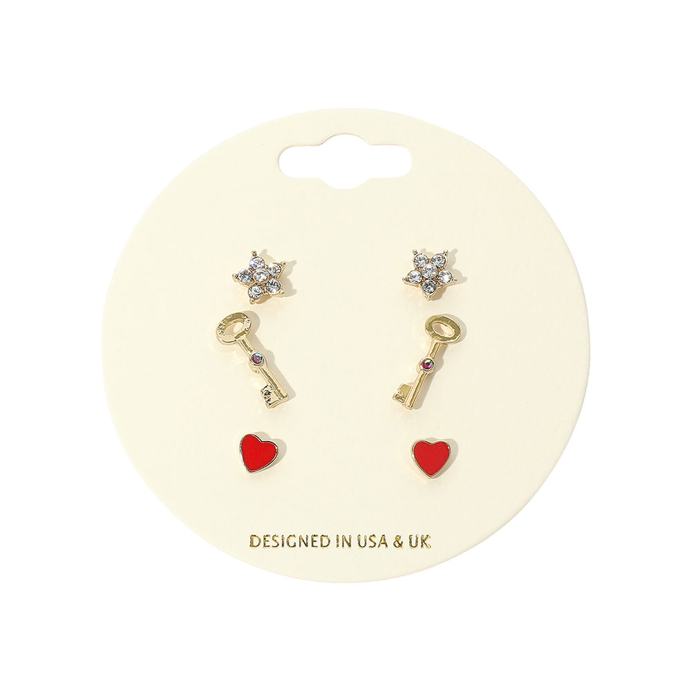 Details • Size : 0.3" L, 0.6" L, 0.25" L • Post Back • Charming earring set featuring three unique stud pairs: starburst, key, and heart designs. A playful and elegant mix for any outfit. Perfect for daily wear or gifting. • Lead and Nickel Compliant