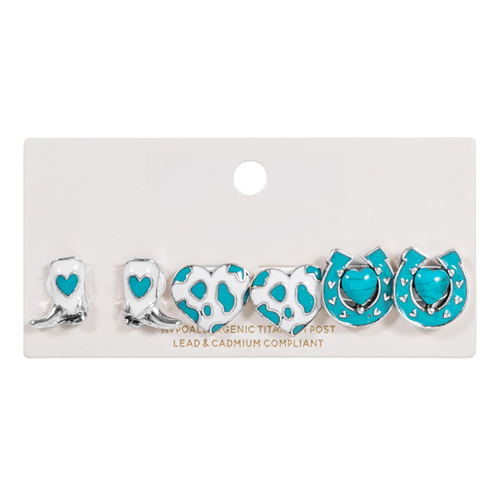 Details • Size : 0.6" L • Titanium Post Back • Three-pair stud earring set featuring heart, boot, and horseshoe motifs designed for easy mix-and-match styling. Perfect for everyday wear or gifting, this coordinated trio offers playful charm and versatile looks, letting you switch up your style with one convenient, themed earring set. • Hypoallergenic • Lead and Nickel Compliant