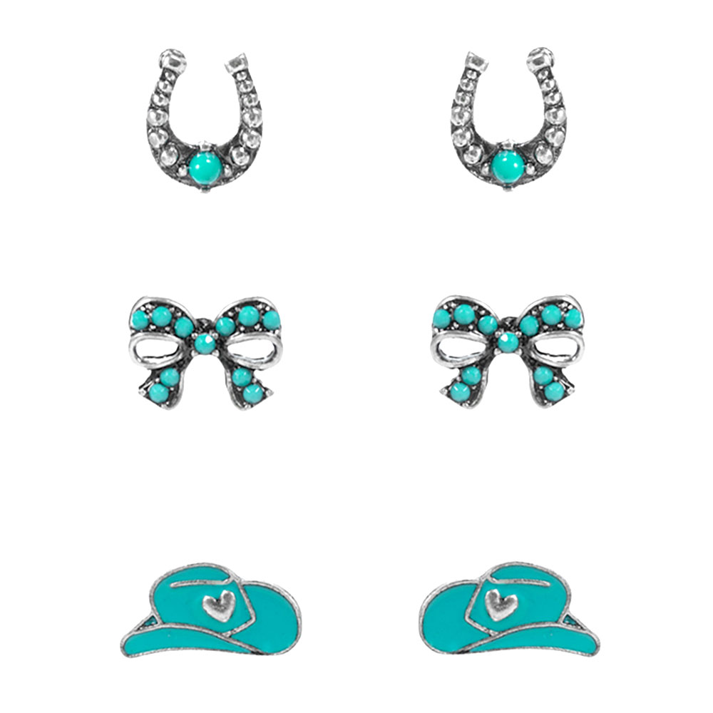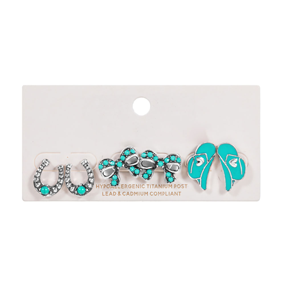 Details • Size : 0.5" - 0.7" L • Titanium Post Back • Three-piece western-inspired stud earring set featuring classic motifs for easy mix-and-match styling. Perfect for everyday wear, festivals, and gift giving, offering versatile looks from subtle accents to standout statement combinations in one convenient coordinated collection. • Hypoallergenic • Lead and Nickel Compliant