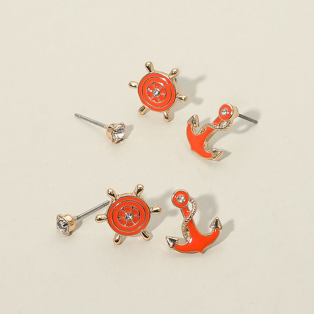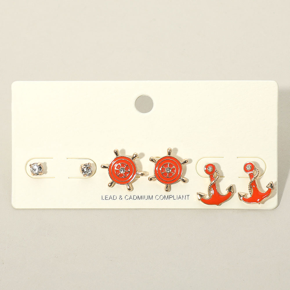 3PCS - Stone Embellished Enamel Ship Wheel Anchor Stud Earring Set