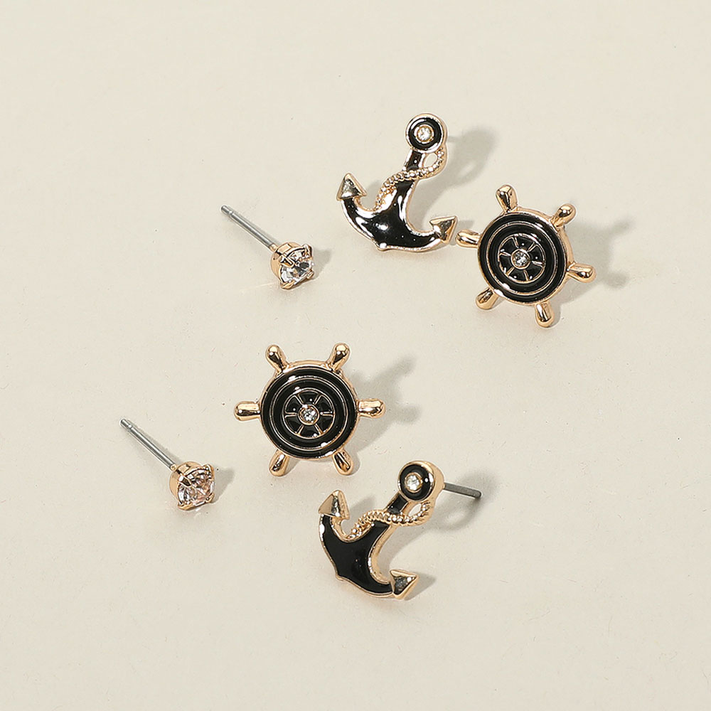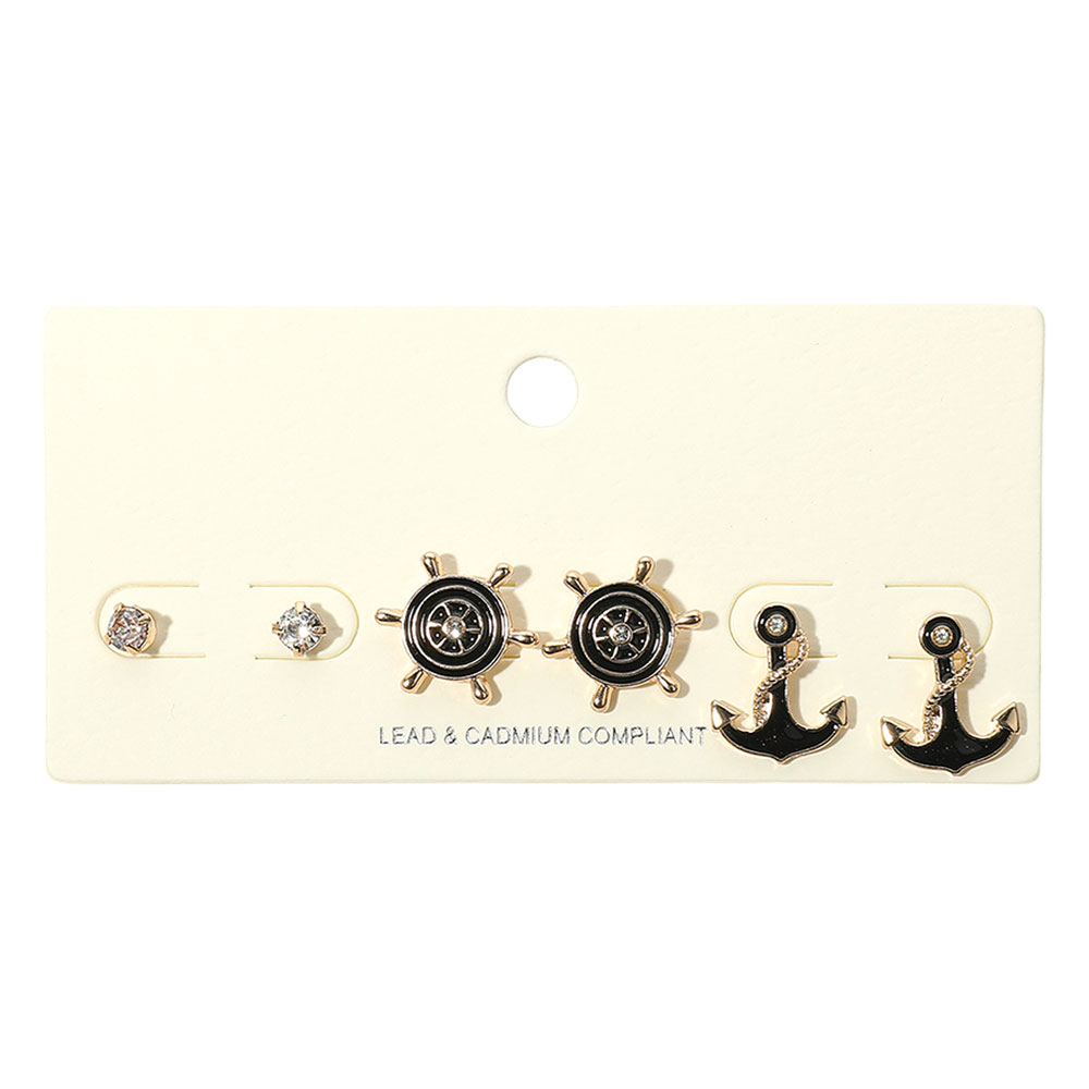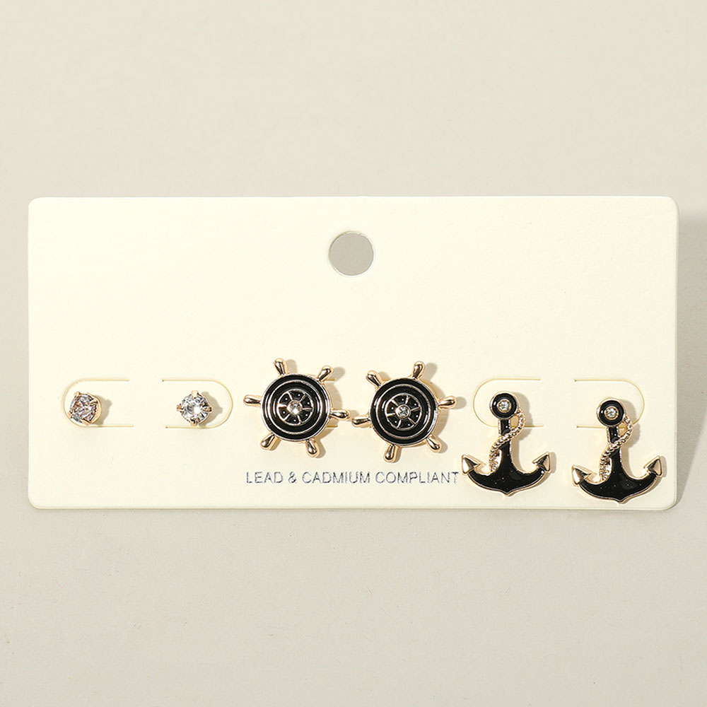 3PCS - Stone Embellished Enamel Ship Wheel Anchor Stud Earring Set