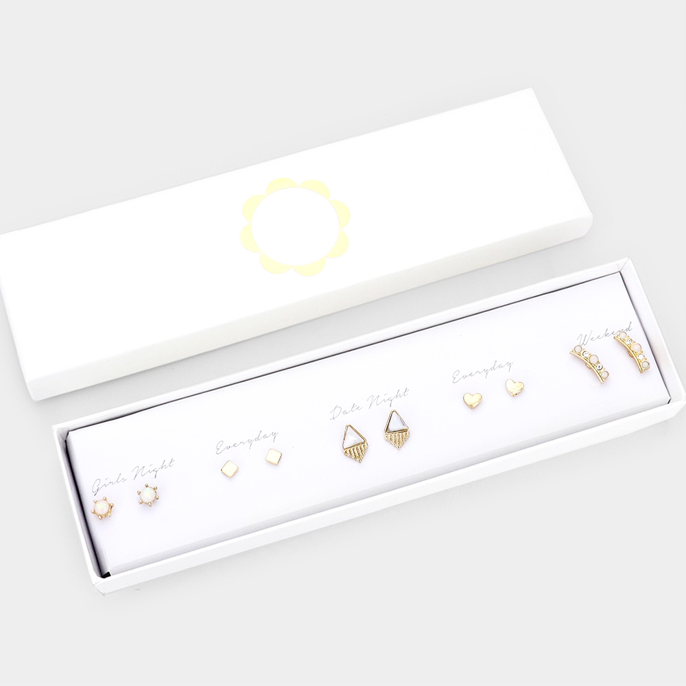 5Pairs - Triangle Natrual Stone Metal Square Heart Mixed Stud Earrings