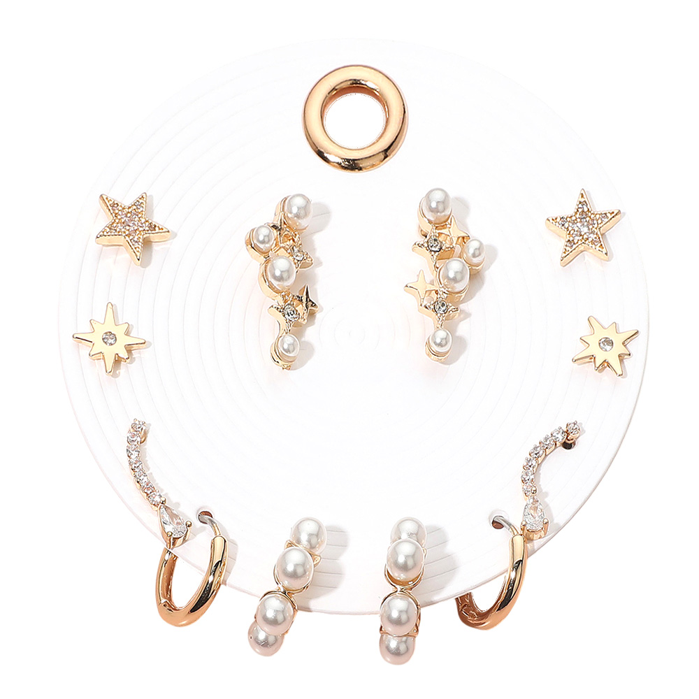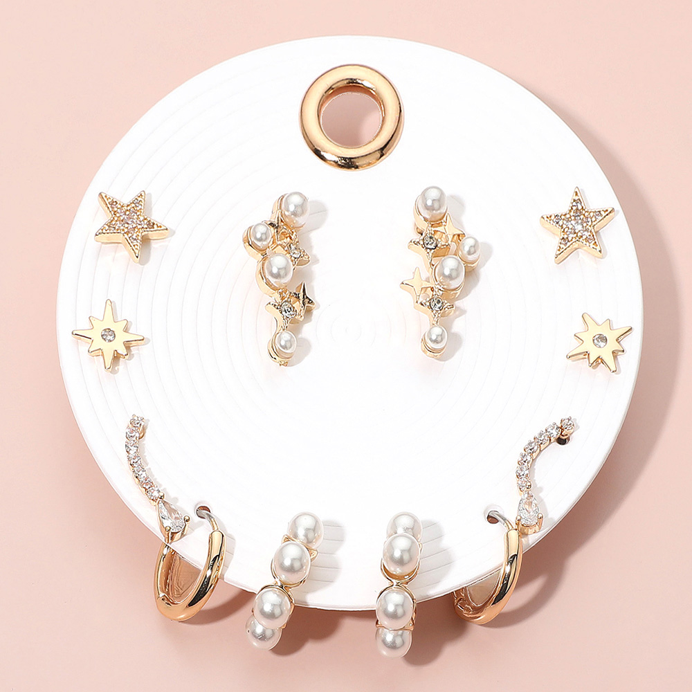 Details • Size : 0.4", 0.5", 0.6", 0.75", 0.8" L • Post Back / Hoop • Shine bright with this 6-pair earring set featuring stars, pearls, hoops, and sparkling accents. A celestial-inspired collection perfect for mixing and matching, daily wear, or gifting to anyone who loves elegant and versatile jewelry. • Lead and Nickel Compliant