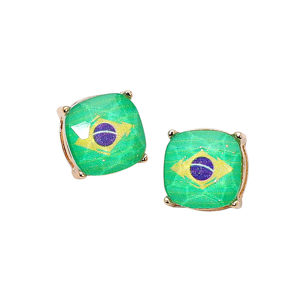Details • Size : 0.5" X 0.5" • Post Back • Show your pride with these Brazil flag stud earrings, featuring the iconic sun emblem design framed in a sleek setting. Perfect for patriotic celebrations, travel, or everyday wear, these earrings combine national spirit with contemporary elegance for a meaningful, stylish accessory. • Lead and Nickel Compliant