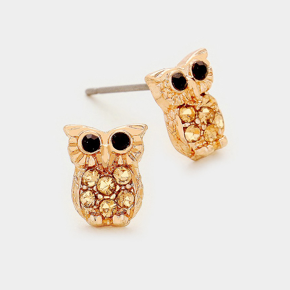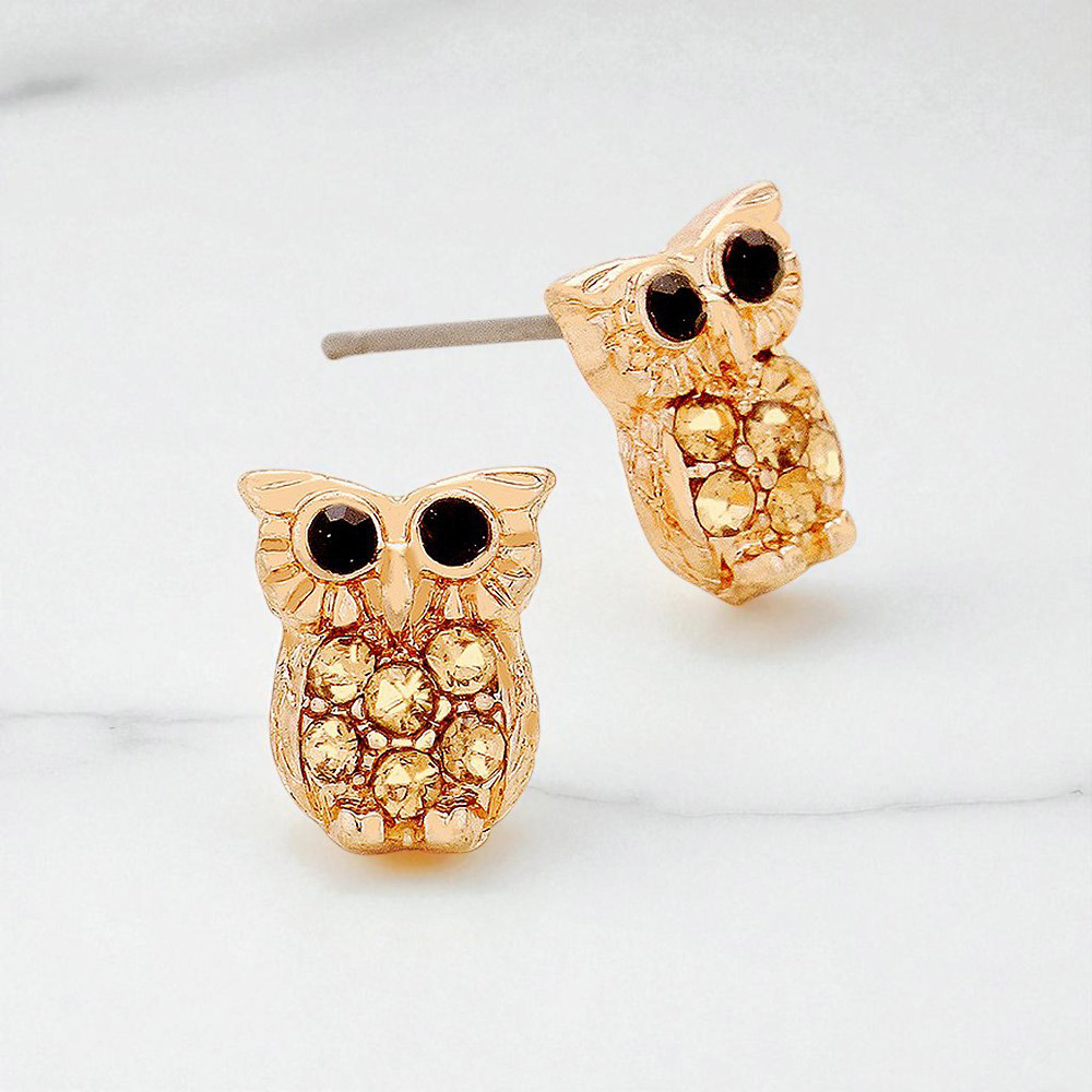 Metal Hoop Rhinestone Embellished Owl Link Pin Catch Earrings