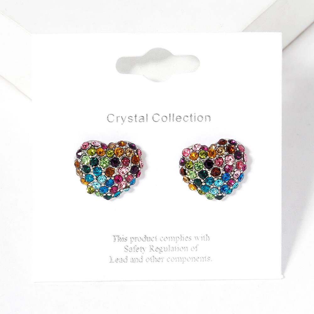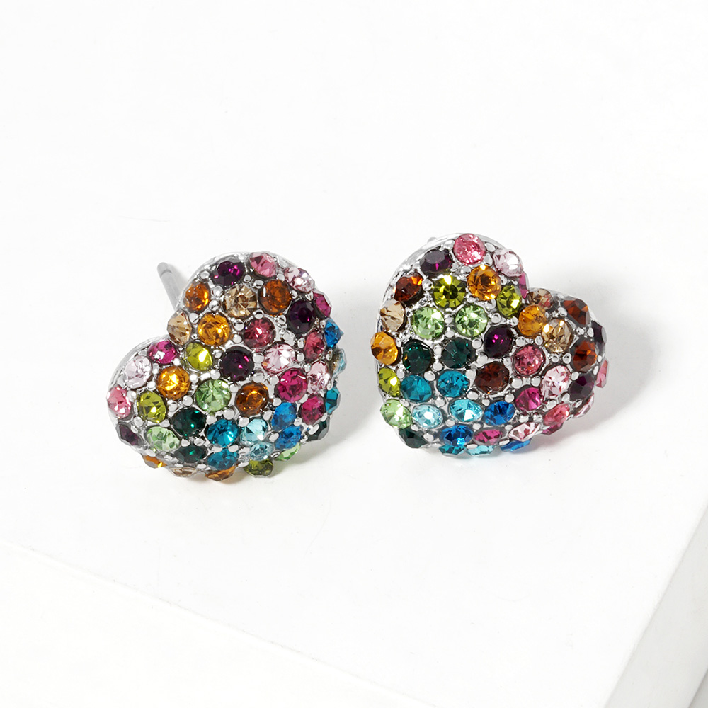 Details • Size : 0.5" X 0.5" • Post Back • Playful heart-shaped stud earrings adorned with sparkling crystal-like accents in a bold, vibrant finish. Perfect for making a fun statement, these lightweight earrings add a pop of personality and shine to any outfit—great for parties, casual wear, or gifting with flair. • Lead and Nickel Compliant