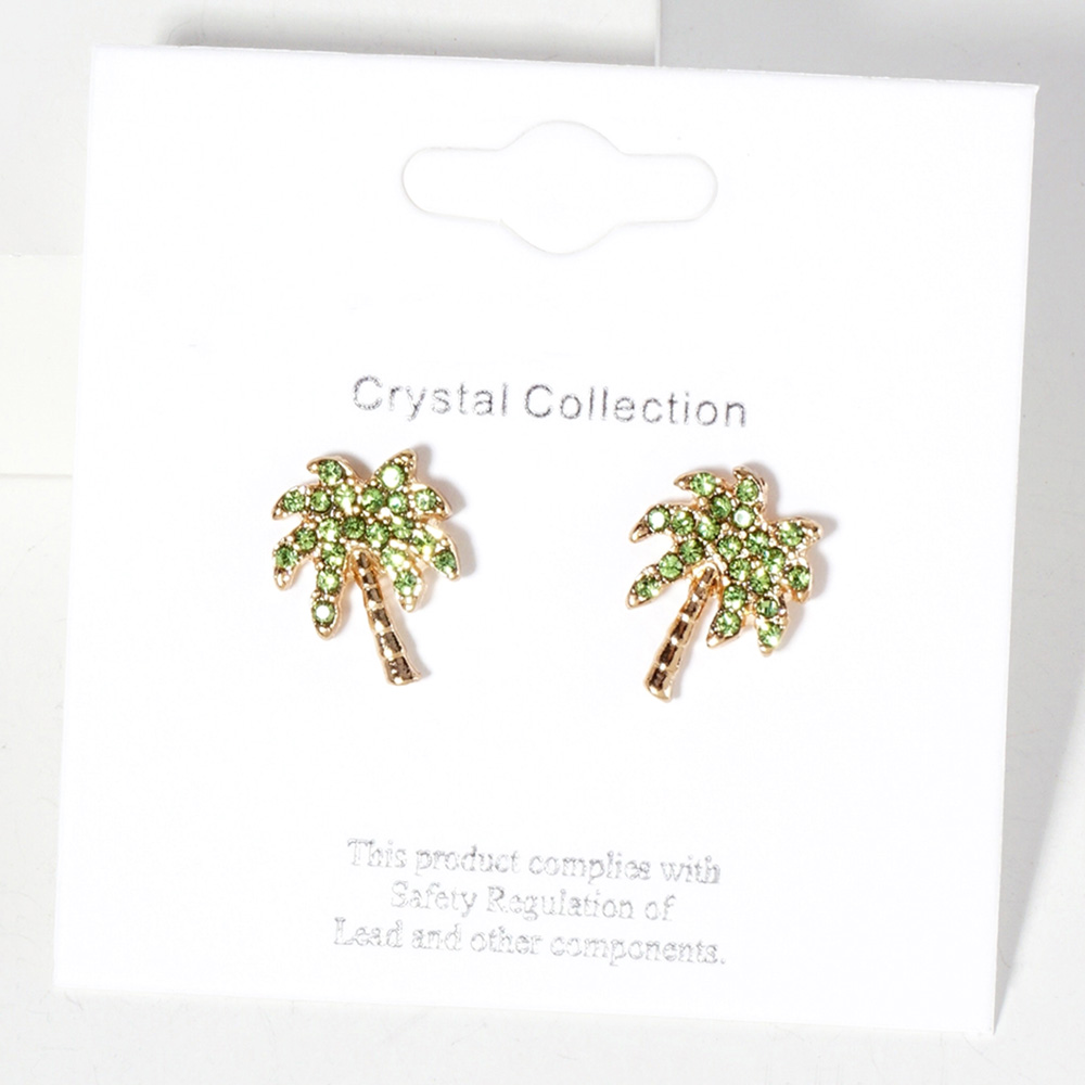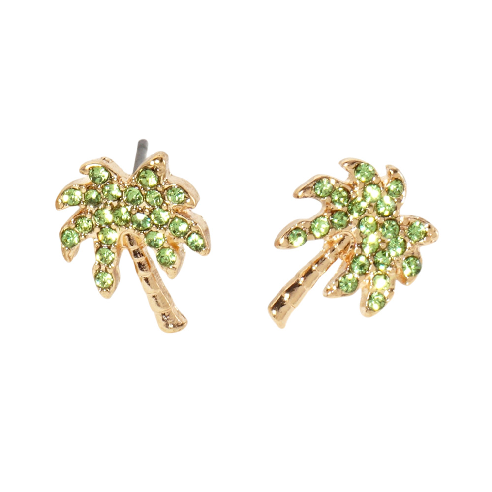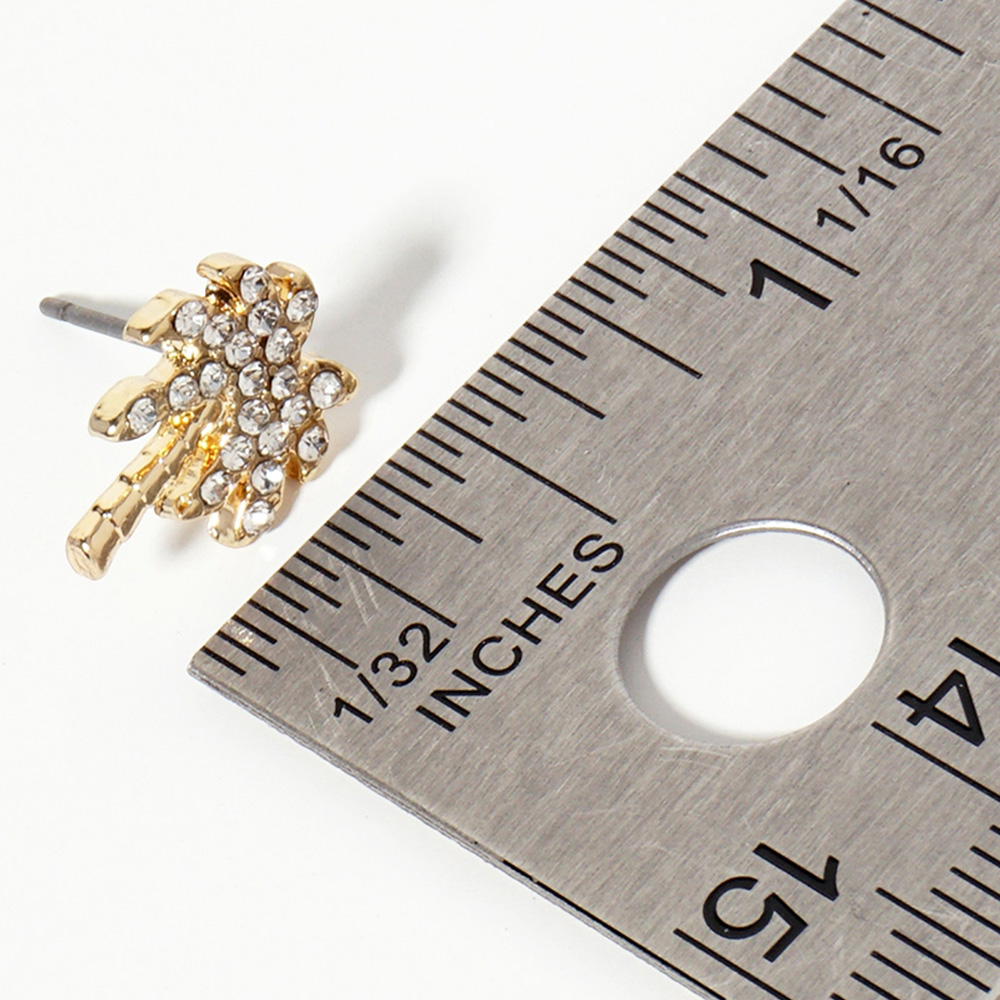 Details • Size : 0.4" X 0.5" • Post Back • Shine with these tropical palm tree crystal stud earrings. Perfect for beach days or summer vibes, these sparkling gold-tone studs add a playful, stylish touch to your accessory collection. • Lead and Nickel Compliant