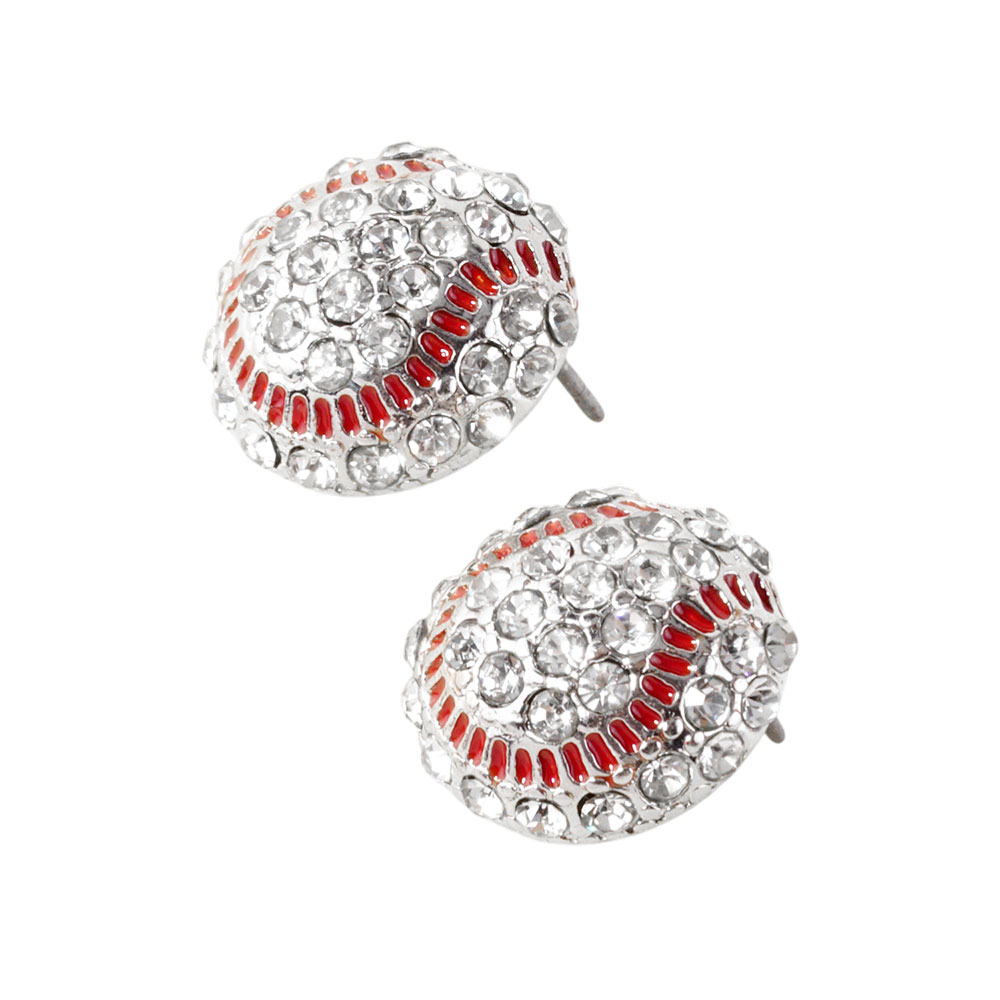 Details • Size : 0.6" X 0.6" • Post Back • Baseball-themed stud earrings adorned with shimmering rhinestones and sporty detailing. A fun accessory for fans and game day outfits. Lightweight and comfortable for all-day wear. • Lead and Nickel Compliant
