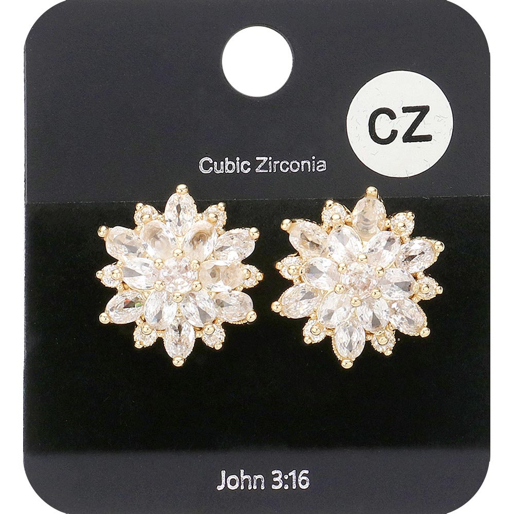 Details • Size : 0.7" X 0.7" • Post Back • Radiant stud earrings in a floral burst design featuring layered marquise-cut stones arranged in a symmetrical pattern. An elegant accessory perfect for special occasions, gifting, or adding dramatic sparkle to day or evening looks. • Lead and Nickel Compliant • CZ Cubic Zirconia