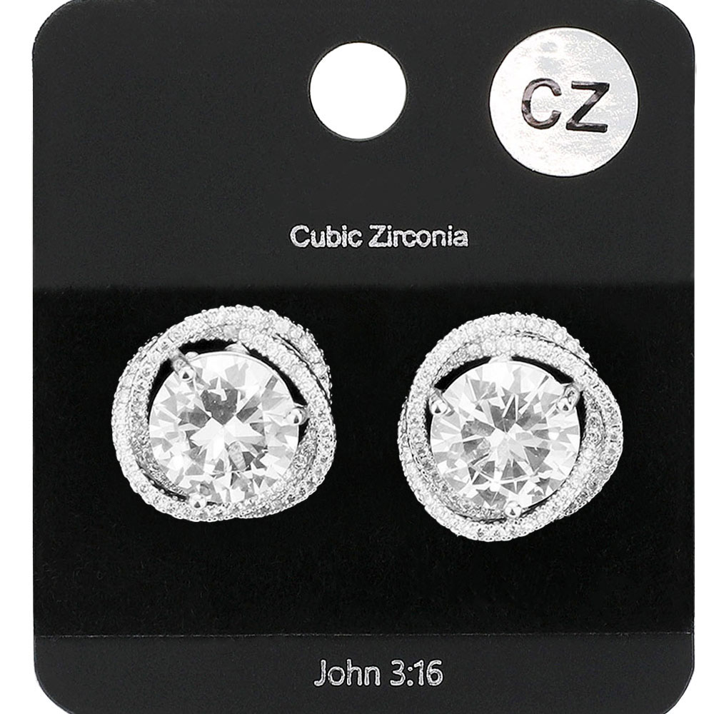• Elegant stud earrings with a round cubic zirconia center stone surrounded by a twisted halo of pavĂ© accents. A refined yet eye-catching design, ideal for weddings, parties, or adding sparkle to any outfit.