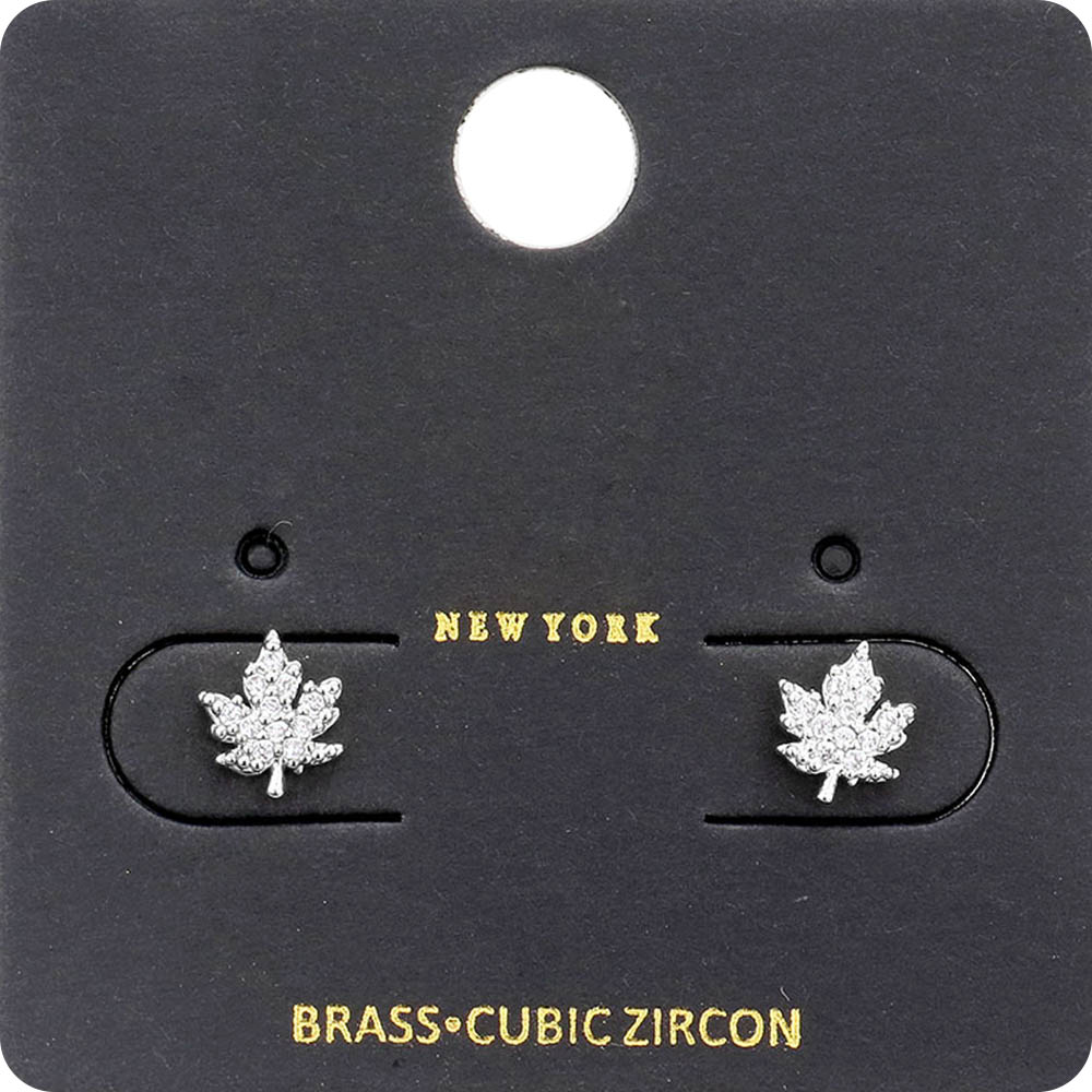 CZ Stone Embellished Brass Metal Maple Leaf Stud Earrings