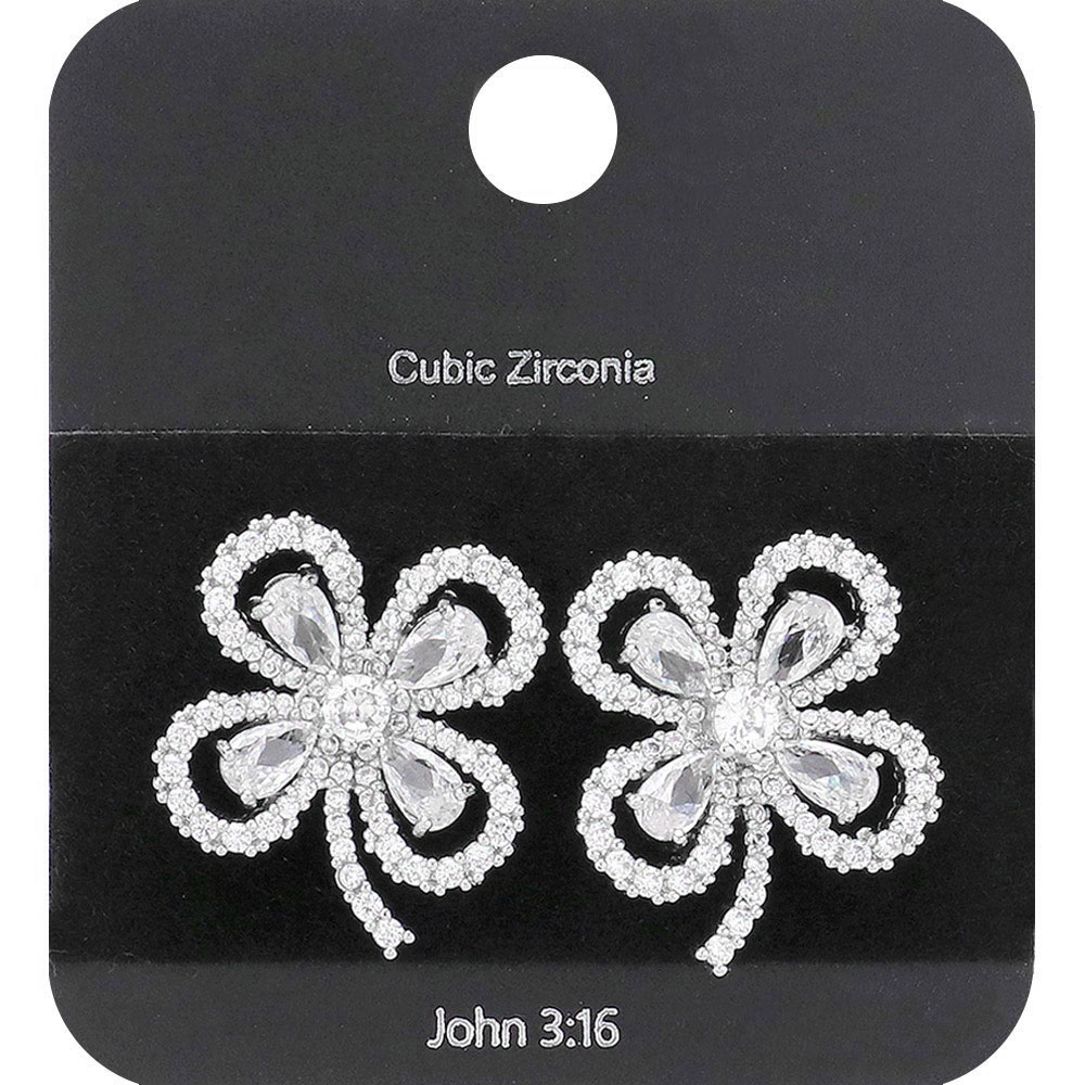 Details • Size : 0.75" X 0.75" • Post Back • Elegant stud earrings shaped like blooming flowers with delicate ribbon-style petals and teardrop accents. Sparkling and refined, perfect for weddings, celebrations, or elevating everyday style with a graceful, feminine touch. • Lead and Nickel Compliant • CZ Cubic Zirconia