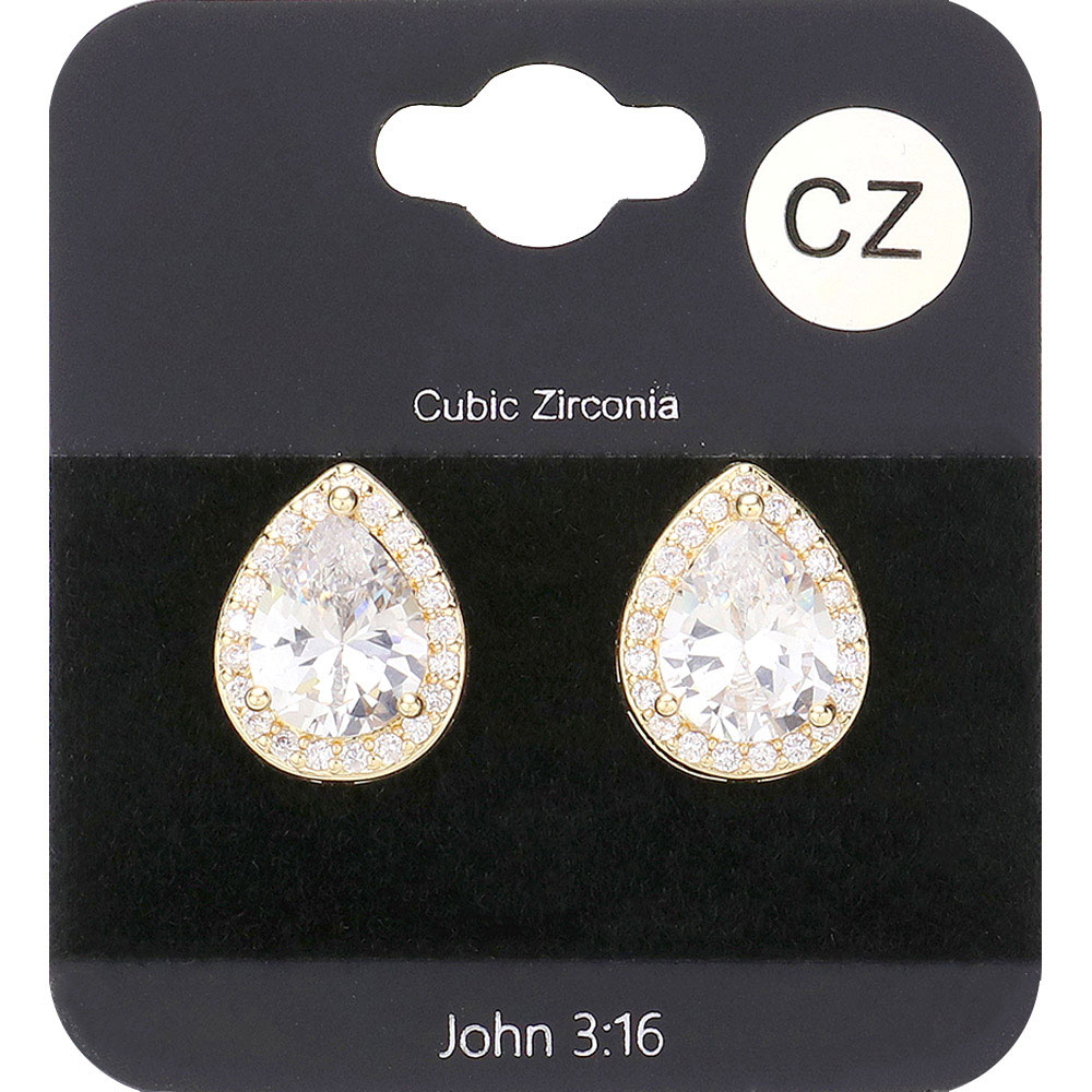 Details • Size : 0.4" X 0.5" • Post Back • Classic teardrop stud earrings featuring brilliant cubic zirconia and a delicate halo accent. A timeless choice for elegant style, suitable for daily wear or special events. • Lead and Nickel Compliant • CZ Cubic Zirconia