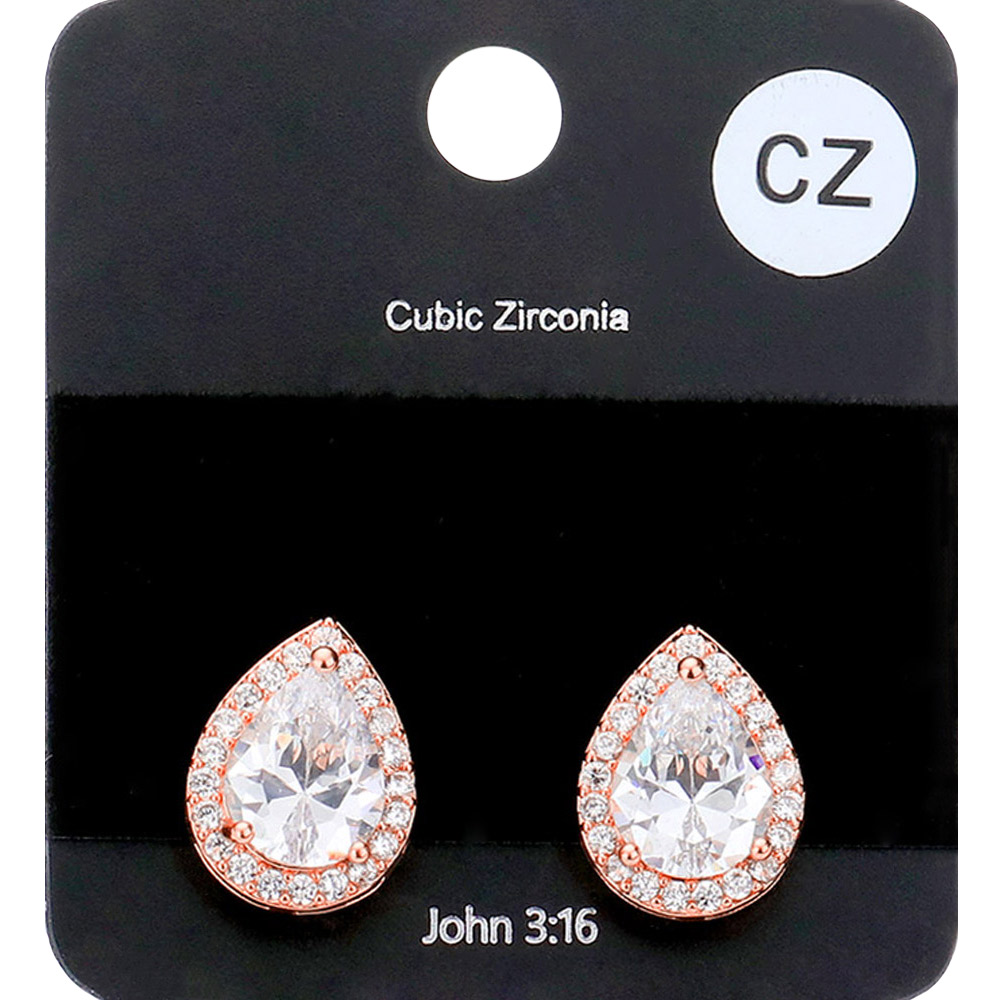 • Classic teardrop stud earrings featuring brilliant cubic zirconia and a delicate halo accent. A timeless choice for elegant style, suitable for daily wear or special events.